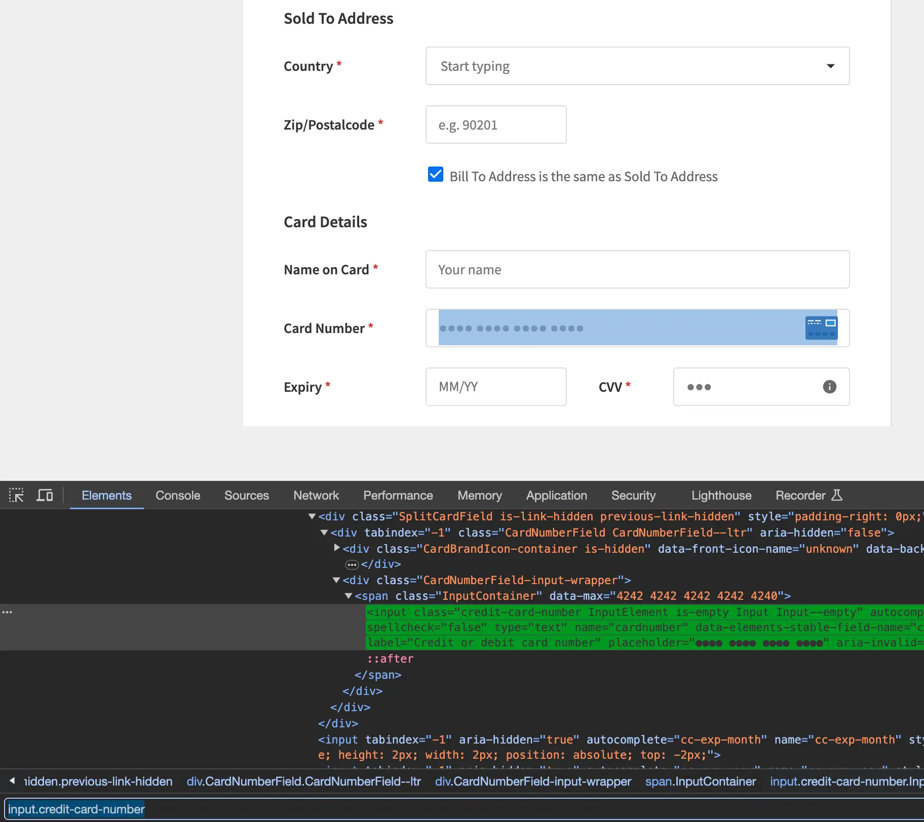 In this example, we want to target an input element with the class credit-card-number within the iFrame with the ID payment-form.