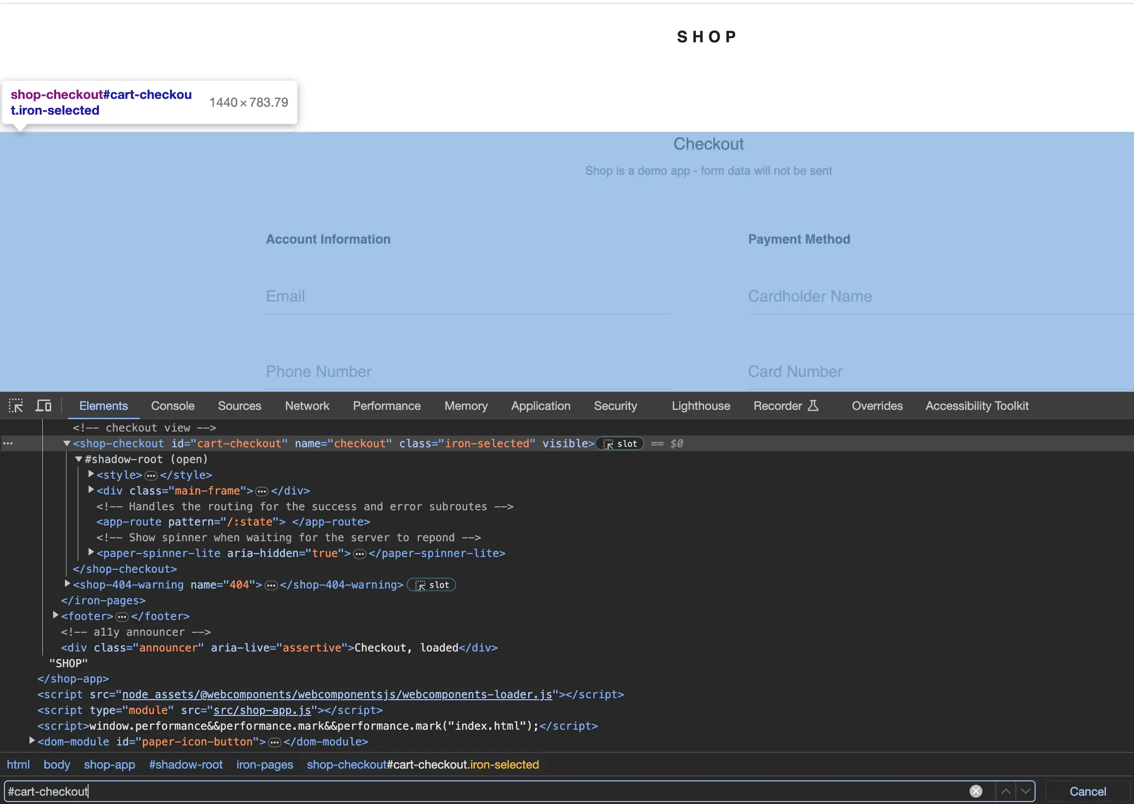- The shadow-root element in the provided image is present under element with ID cart-checkout, and its corresponding CSS selector is #cart-checkout