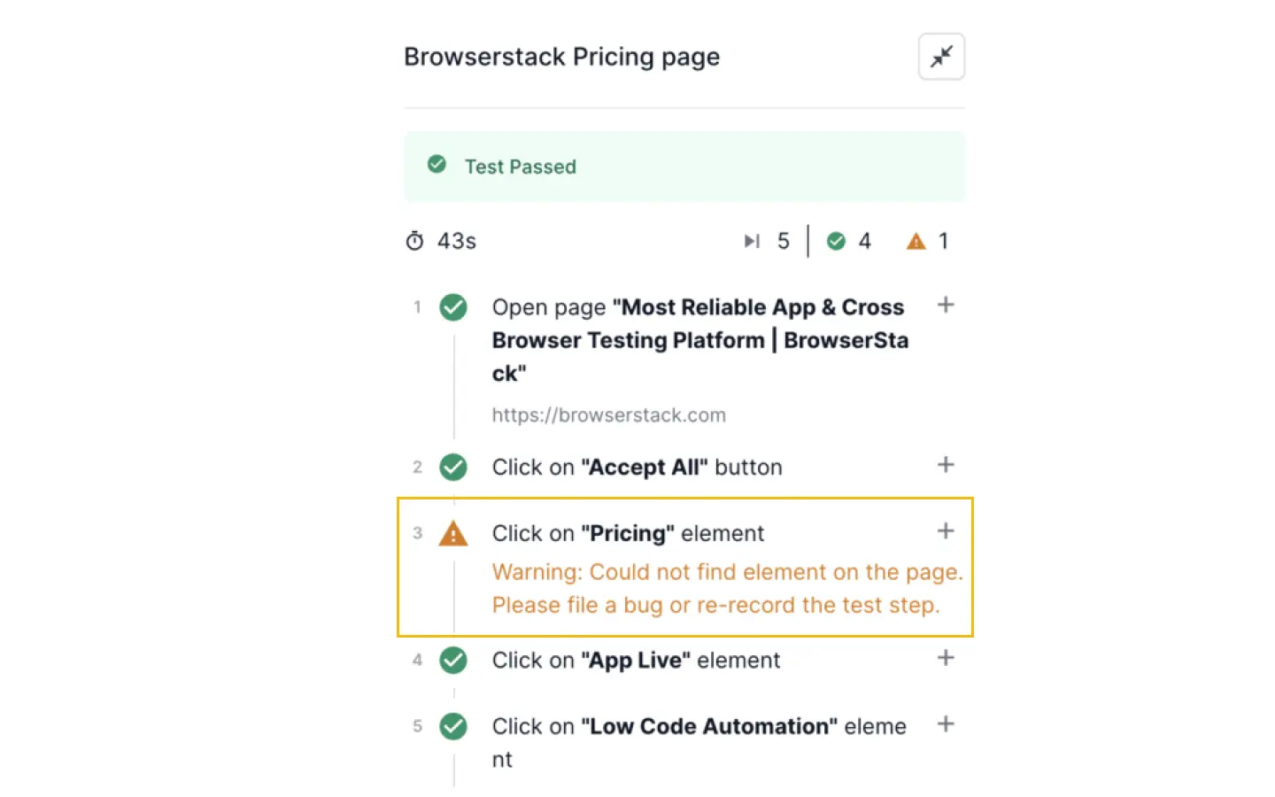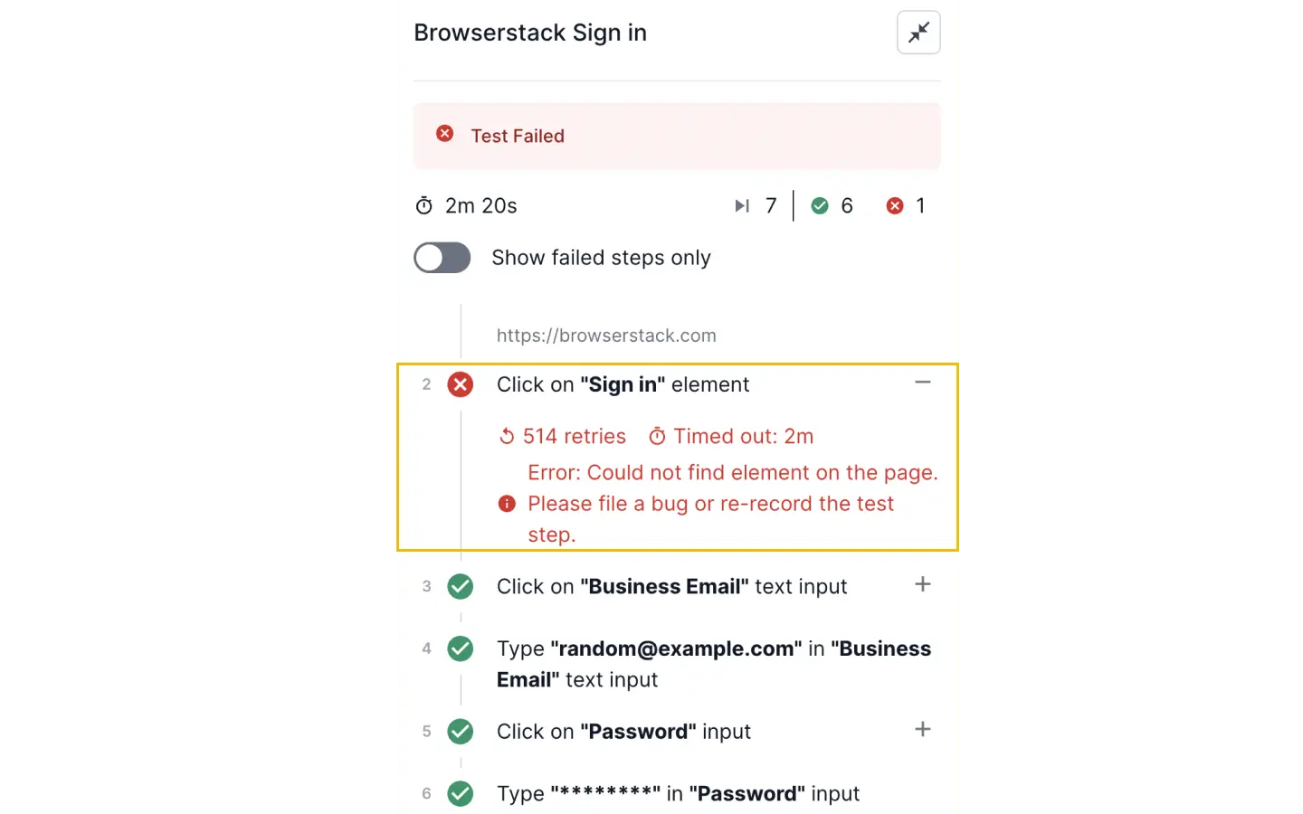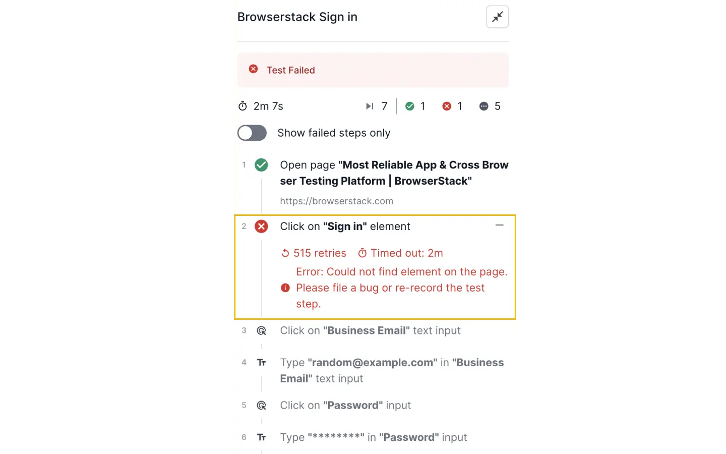 If the browser elements don’t load in time during test execution, the test might encounter incorrect results. Here’s where BrowserStack’s Low Code Automation offers a smart solution to set wait timeouts for different steps. By default, it intelligently detects the best wait time based on network requests and page navigations during the recording process. This ensures that the test is more stable even if the element sometimes takes slightly longer time to load during execution.
