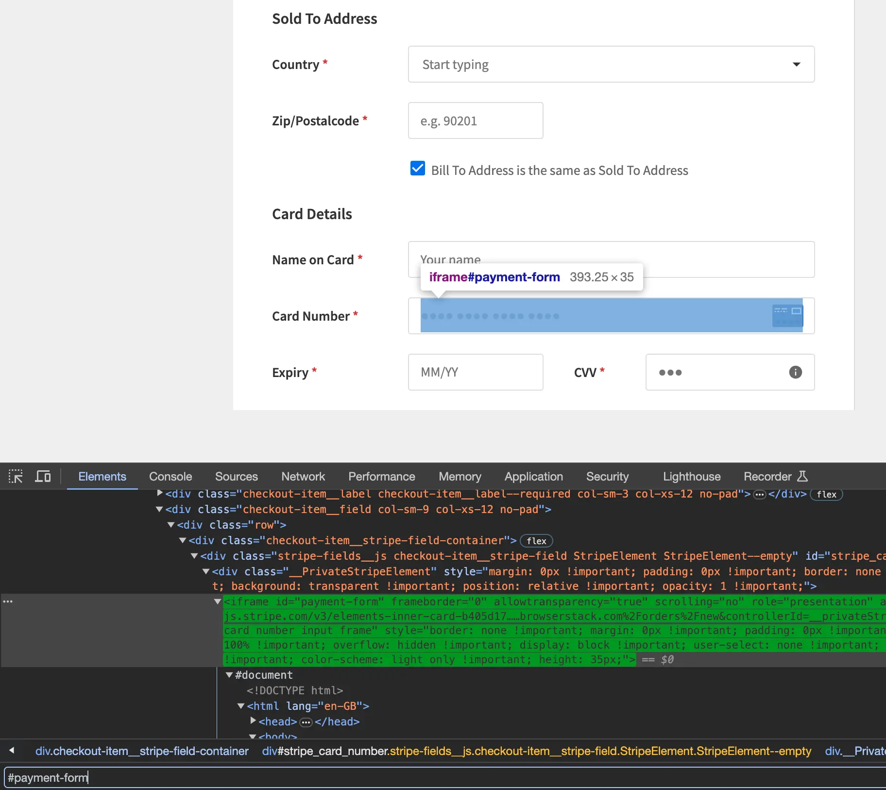 - The iframe element in the provided image is identified by the ID payment-form, and its corresponding CSS selector is #payment-form