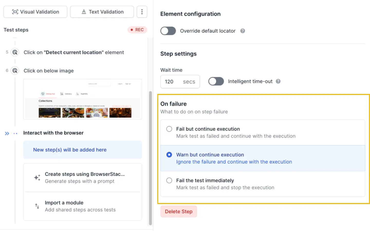Low code automation provides you with options for handling test failures. You can decide what action to take when a test step fails.