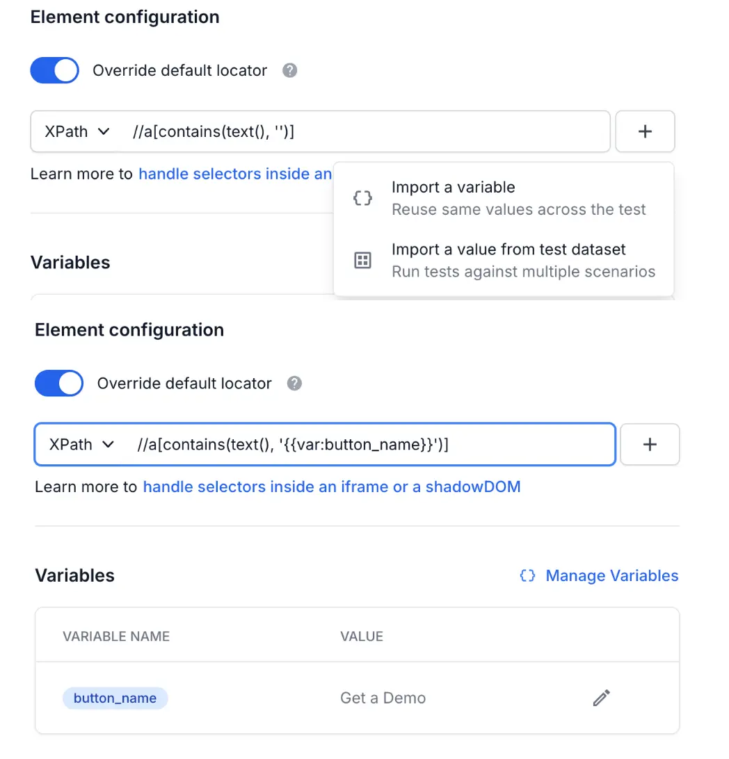 - You can now also import variables in your custom locators. Click the + icon next to the locator text input box.