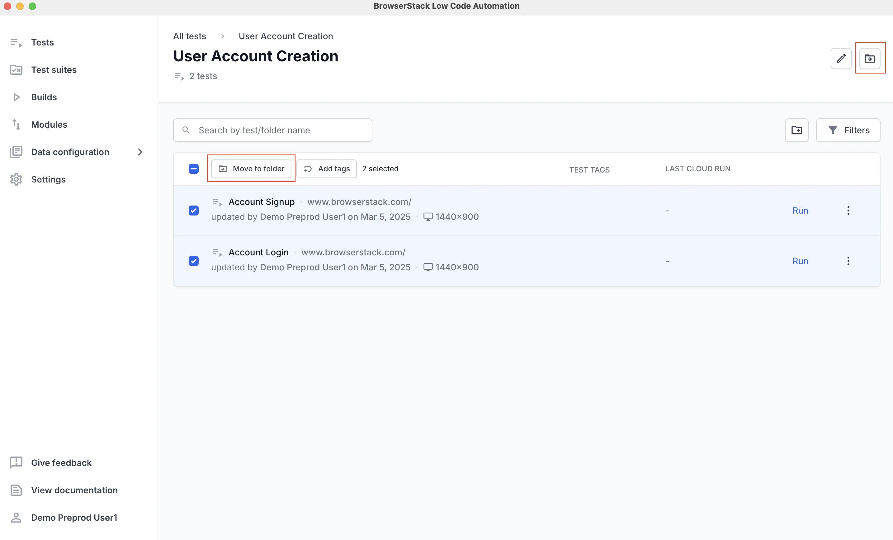- Go to Tests, choose one or more tests or folder and click the Move to folder button.