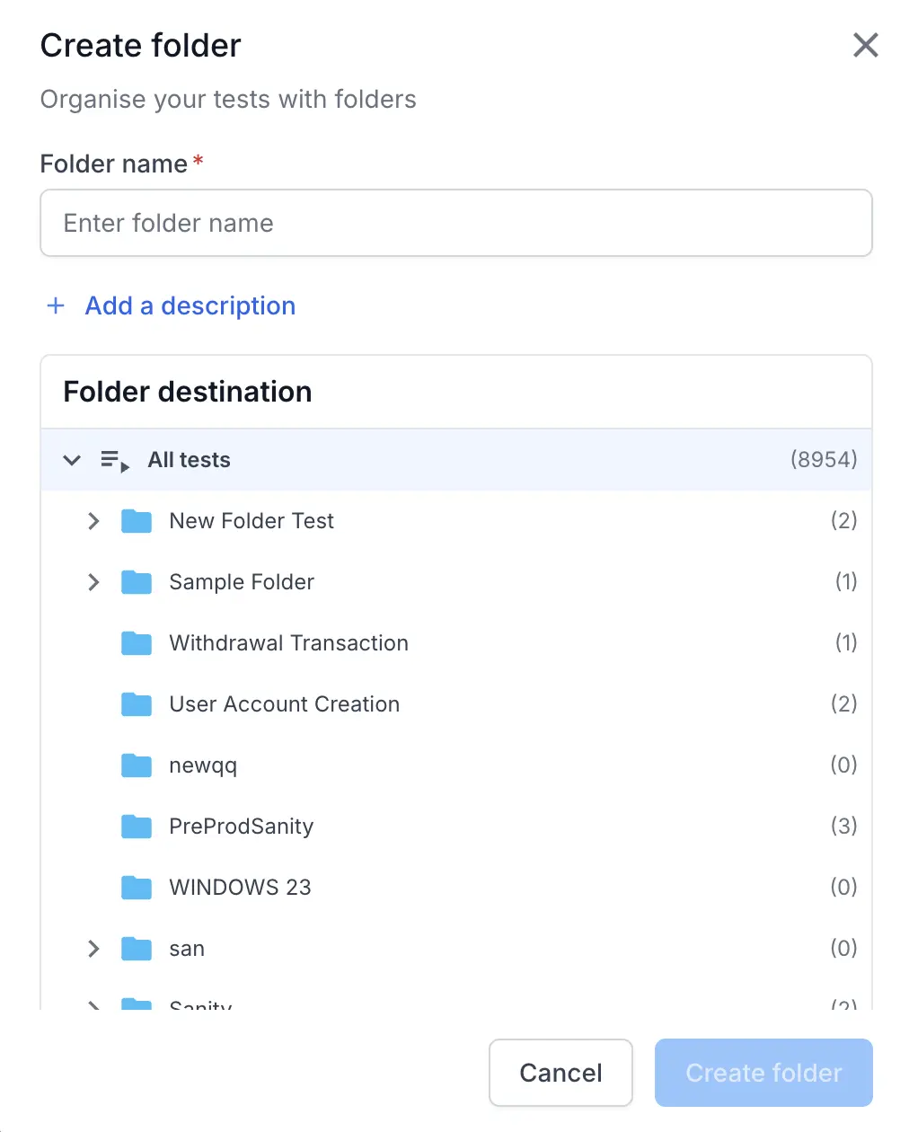 - Under Folder destination, choose the location where you want to create the new folder. The root folder is All tests. You can expand all folders and create sub-folders as well.