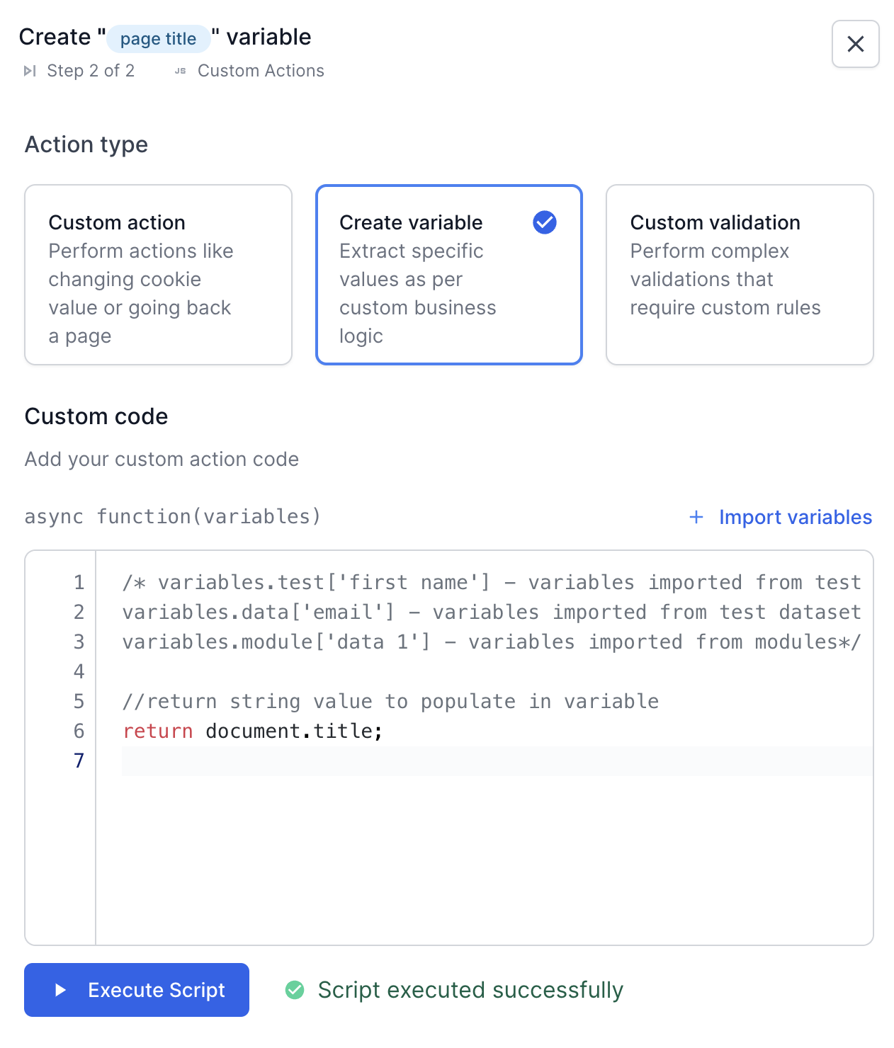 Use this option to generate a string value using JavaScript. Return a string value, which will be stored in a variable with a name you provide. You can import the variable into any of the following steps.
