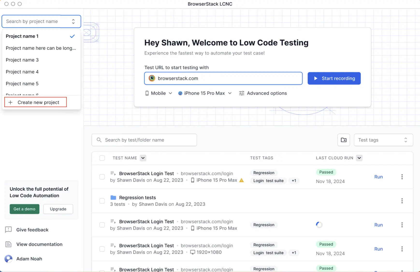 In Low Code Automation, the Projects feature allows you to create dedicated workspaces for your teams. This enables you to view only your team’s tests, test suites, and builds, improving organization and data segregation. With dedicated projects, it is easier to focus on team-specific tasks without interference from other teams. A team can have multiple projects.