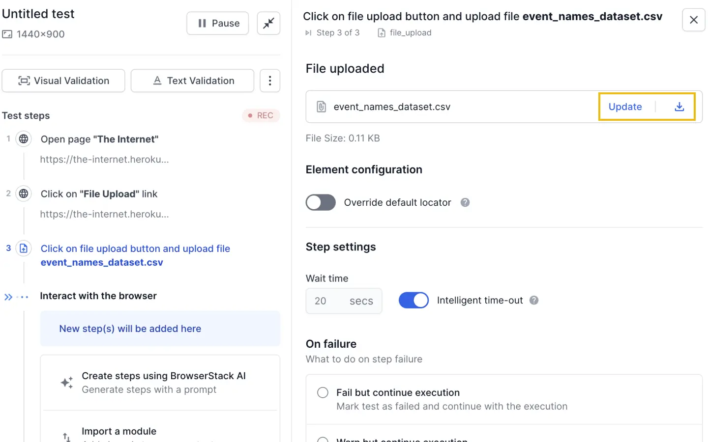 - To update the file in the test, click the Update option. The updated file will be used for all future test runs.