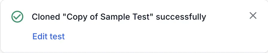 Click the three dots icon next to the required test and select Clone test. A new copy of the existing test will be created and the following message appears.