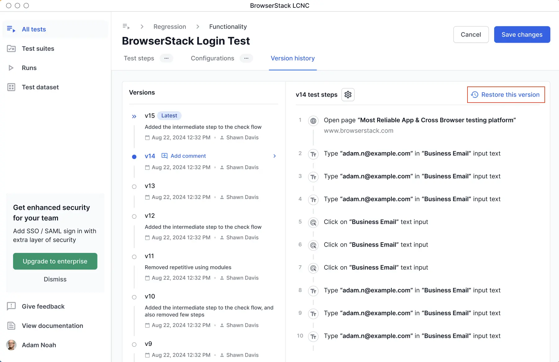 Version history: Choose the version you want to restore and click Restore this version. This reverts the test to the selected version and discard any changes you made. For more information, refer to Test version history.