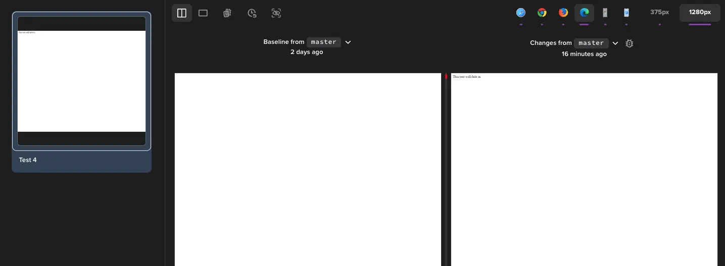 The element starts with opacity: 0 and gradually changes to opacity: 1 during the animation. However, because Percy disables animations, this element won’t be visible in Percy.