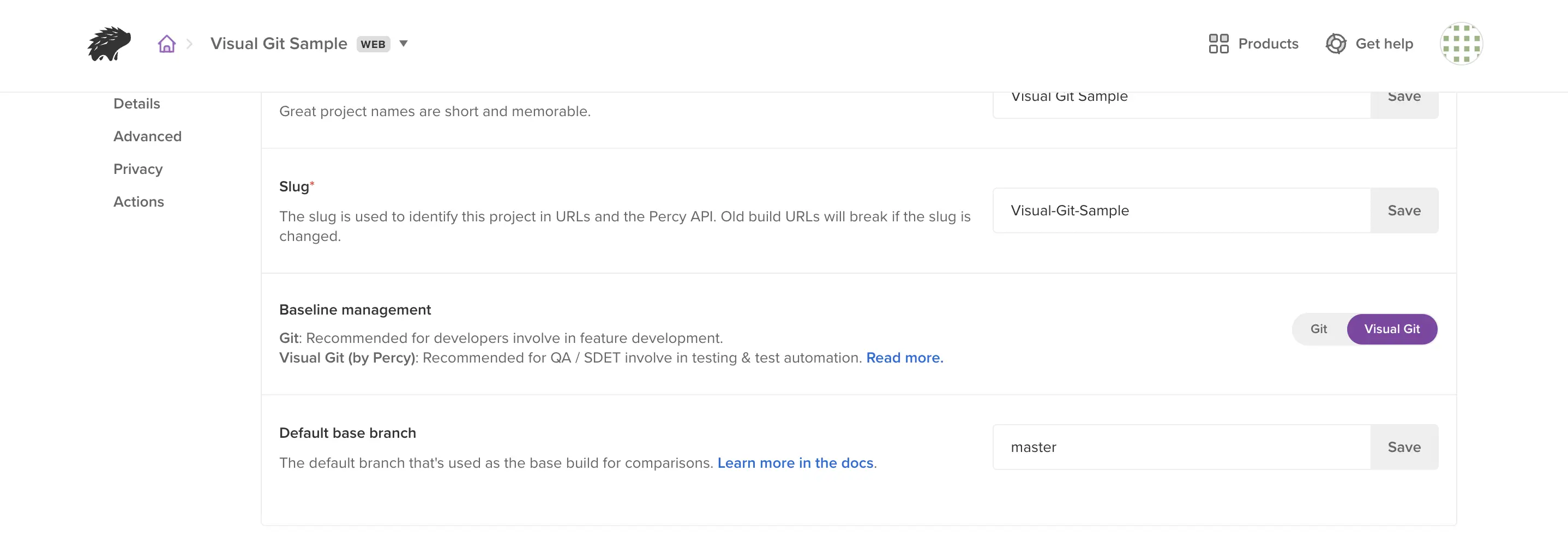 By default, Percy uses “master” as the default base branch. You can configure a branch to serve as the default base for comparisons. If your Git project’s main branch has a different name, it’s important to update your Percy settings to match. This ensures smooth integration and accurate visual reviews. Configuring the default base branch ensures that all subsequent branches derive their baseline for comparisons from the specified default base branch.