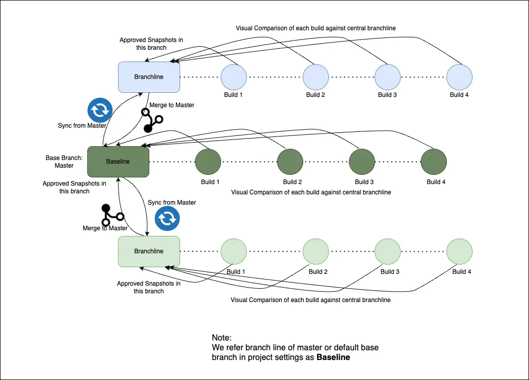 Visual Git is a specially designed visual version control system, where Percy does not rely on Git commit information. In this case, Percy establishes a branchline, which is the central repository for every branch, containing all approved snapshots. The primary advantage is maintaining an independent snapshot repository for your branch and merging changes back to a central repository, enabling your entire team to utilize the updated central repository.