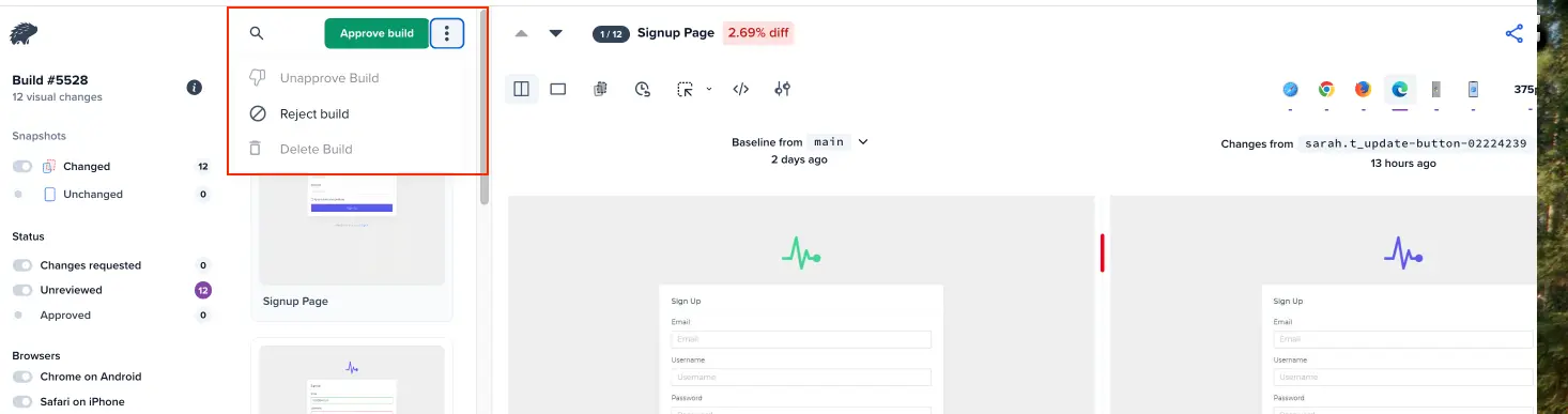 • If you approve the build and want to unapprove a snapshot, a confirmation modal appears.