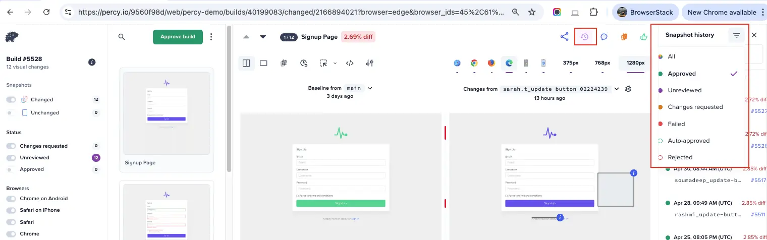 For detailed information about the approval process, including how to review, approve, and manage snapshots, visit the Percy Approval workflow page.