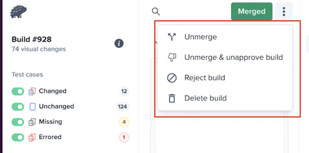 • Unmerge and unapprove build – Unmerge the build and change its status to unapproved.