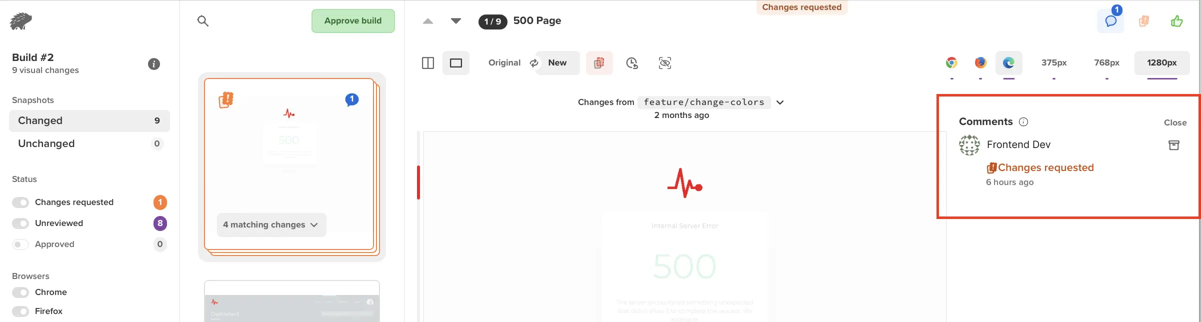 In addition to approving snapshots with visual changes, you can also “request changes.” Keep in mind that you can only request changes on snapshots, not individual screenshots.