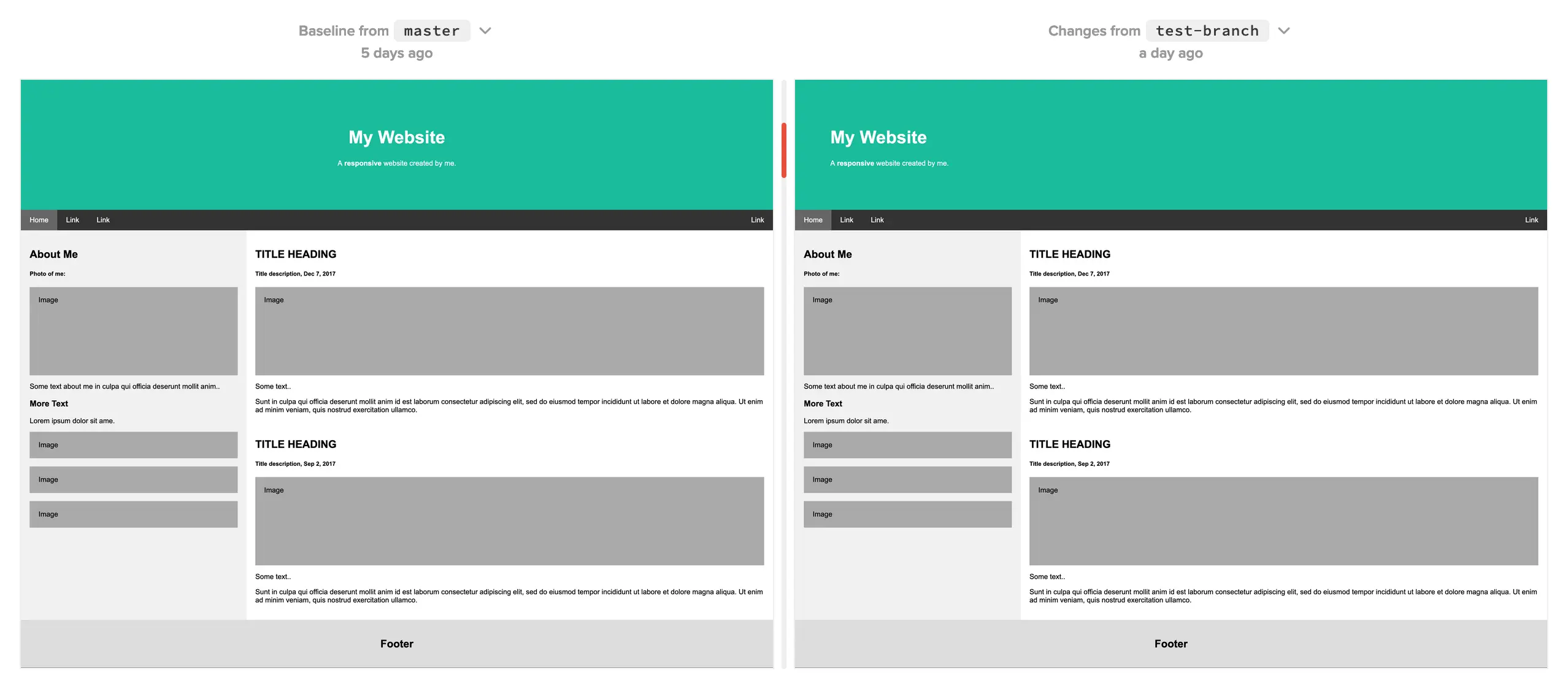 The diff highlighter is a static bar alongside a new image showing where changed areas are located. Very small changes or elements that match the diff overlay color may be difficult to spot. The highlighter can help identify where differences are at quick glance instead of having to zoom in or enable the diff overlay.