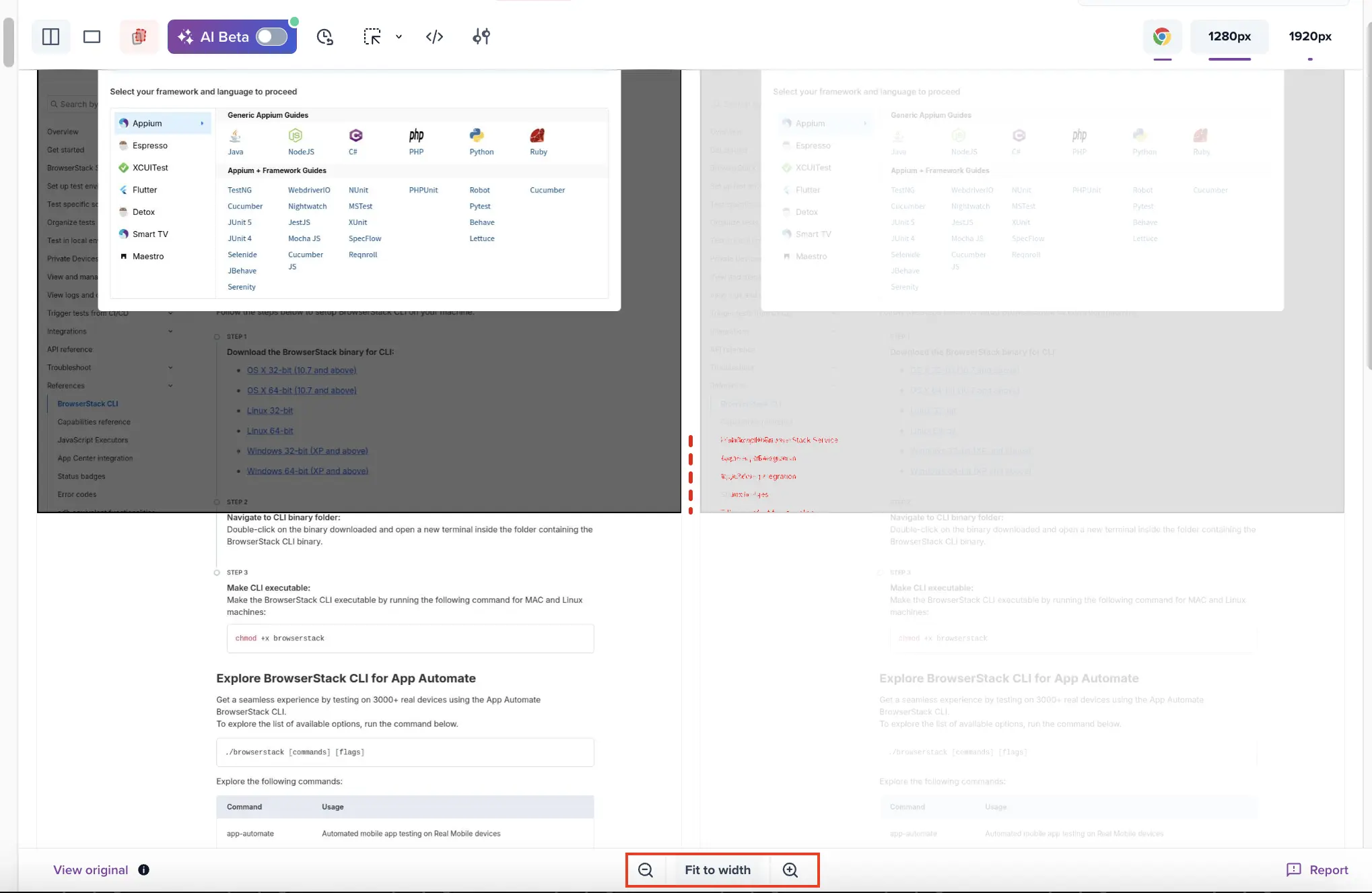 Easily zoom in and out of snapshots to inspect differences in detail while maintaining context. Use the zoom controls such as cursor magnification, zoom-in, and zoom-out buttons to adjust the view.