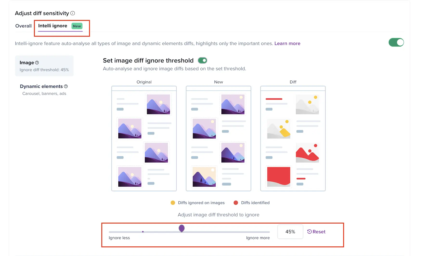 - The diff sensitivity applies to the whole webpage; Intelli Ignore operates solely for images.