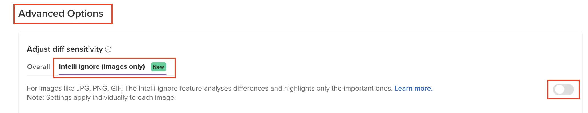 Intelli Ignore is automatically activated for all Percy projects created after April 8th, 2024. For older projects, you can enable this feature by accessing project settings. Within the Advanced Options section, choose Intelli ignore (images only) under Adjust diff sensitivity. Simply toggle the button to enable this feature.