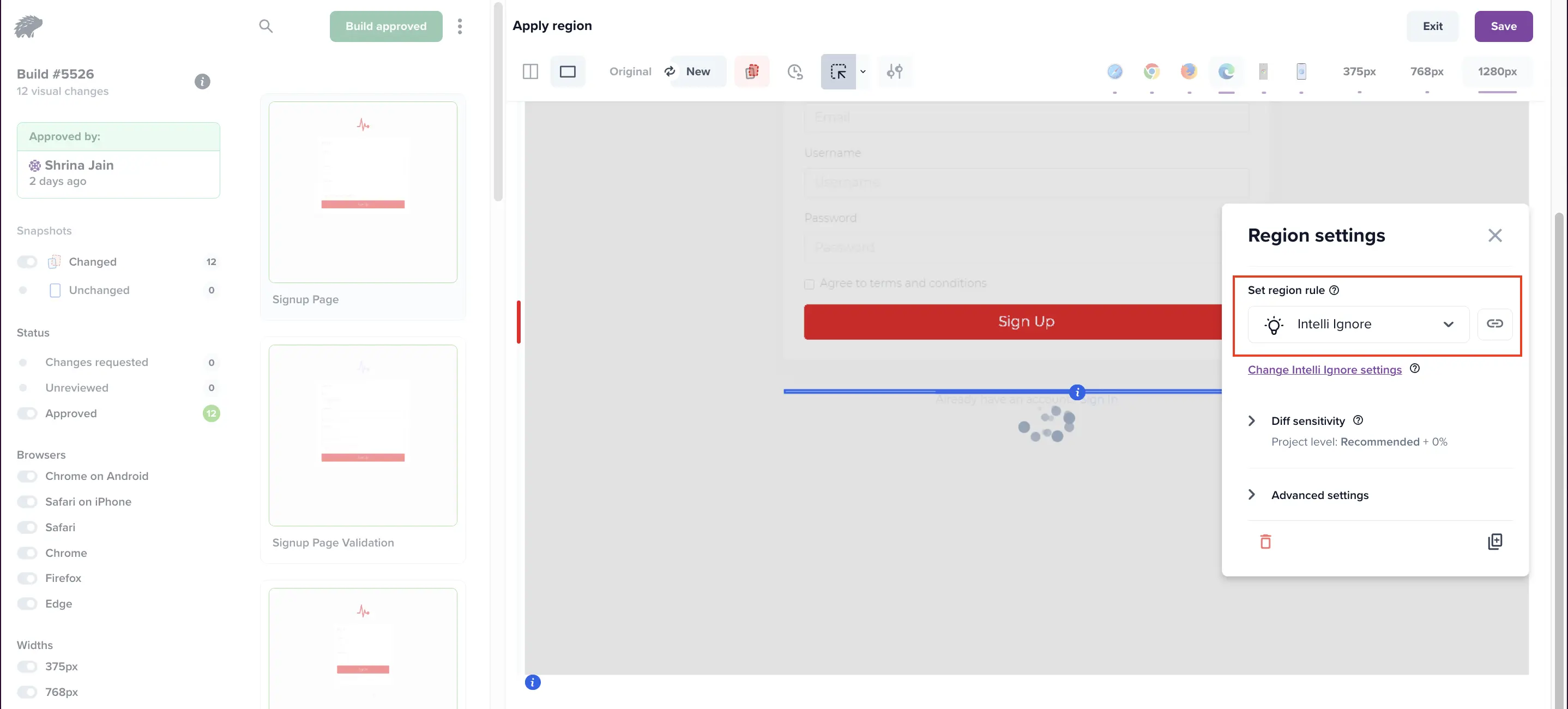 Use the Intelli Ignore rule under the Select regions option to examine contextual differences on Percy builds. For more information, refer to Define regions via UI.