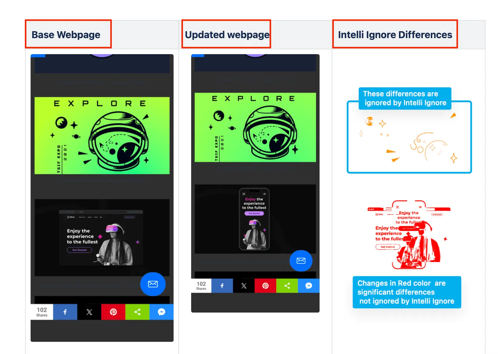 Intelli Ignore, is a remarkable feature which enhances the stability of a webpage by meticulously analyzing image differences and pinpointing only those discrepancies that genuinely matter to the human eye. Crafted to mitigate false positives stemming from network glitches, varying image types, or external factors, Intelli Ignore adeptly refines the testing process.
