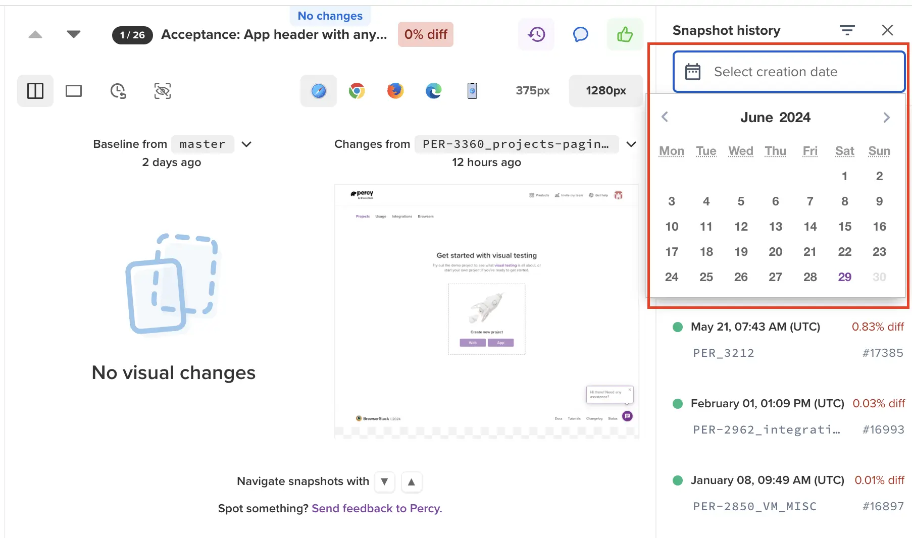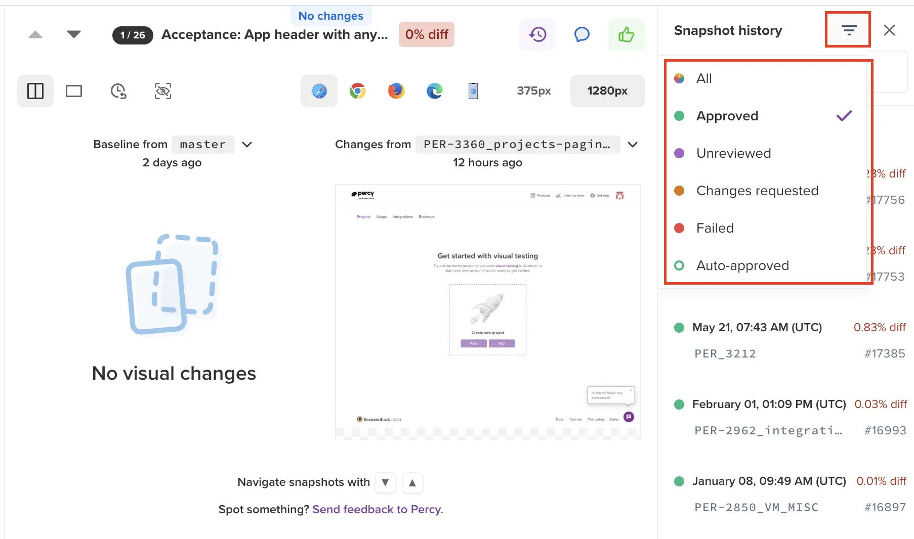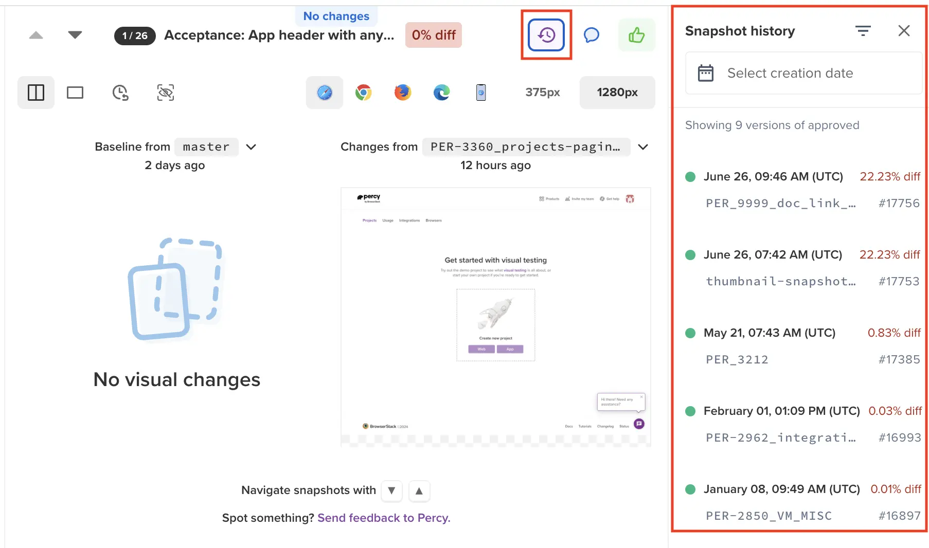 Easily track and manage snapshot history with Percy.