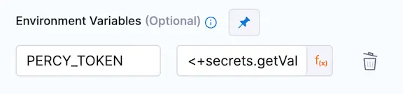 In the Environment Variables section, click the + Add button and enter PERCY_TOKEN in the left field and <+secrets.getValue("PERCY_TOKEN")> in the right.