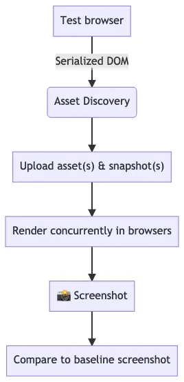 Once the DOM is captured & serialized, it gets sent to @percy/core for asset discovery. Asset discovery renders the captured DOM in a Chromium browser, where the SDK intercepts all network requests the DOM makes. This captures assets needed to render the page in Percy’s infrastructure for a screenshot. By default, all assets served on the same hostname as the tests are captured. You can capture more hostnames with the allowed-hostnames config key. Asset discovery also resizes the viewport to the passed widths to ensure assets are captured for the right screen sizes.