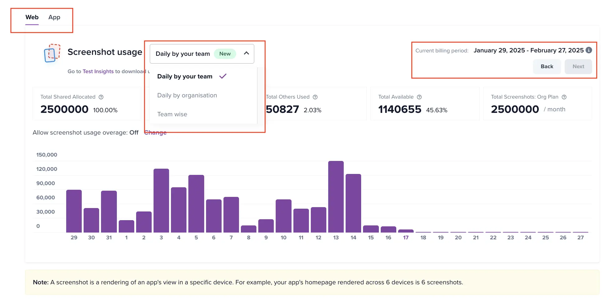 - Toggle between the Web and App tabs to check respective screenshot usage.