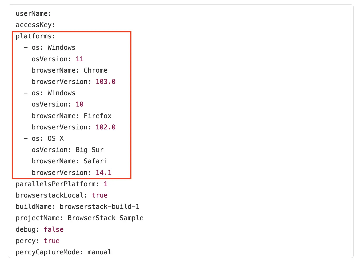 In your BrowserStack configuration file, include the following browser details under the platform attribute: