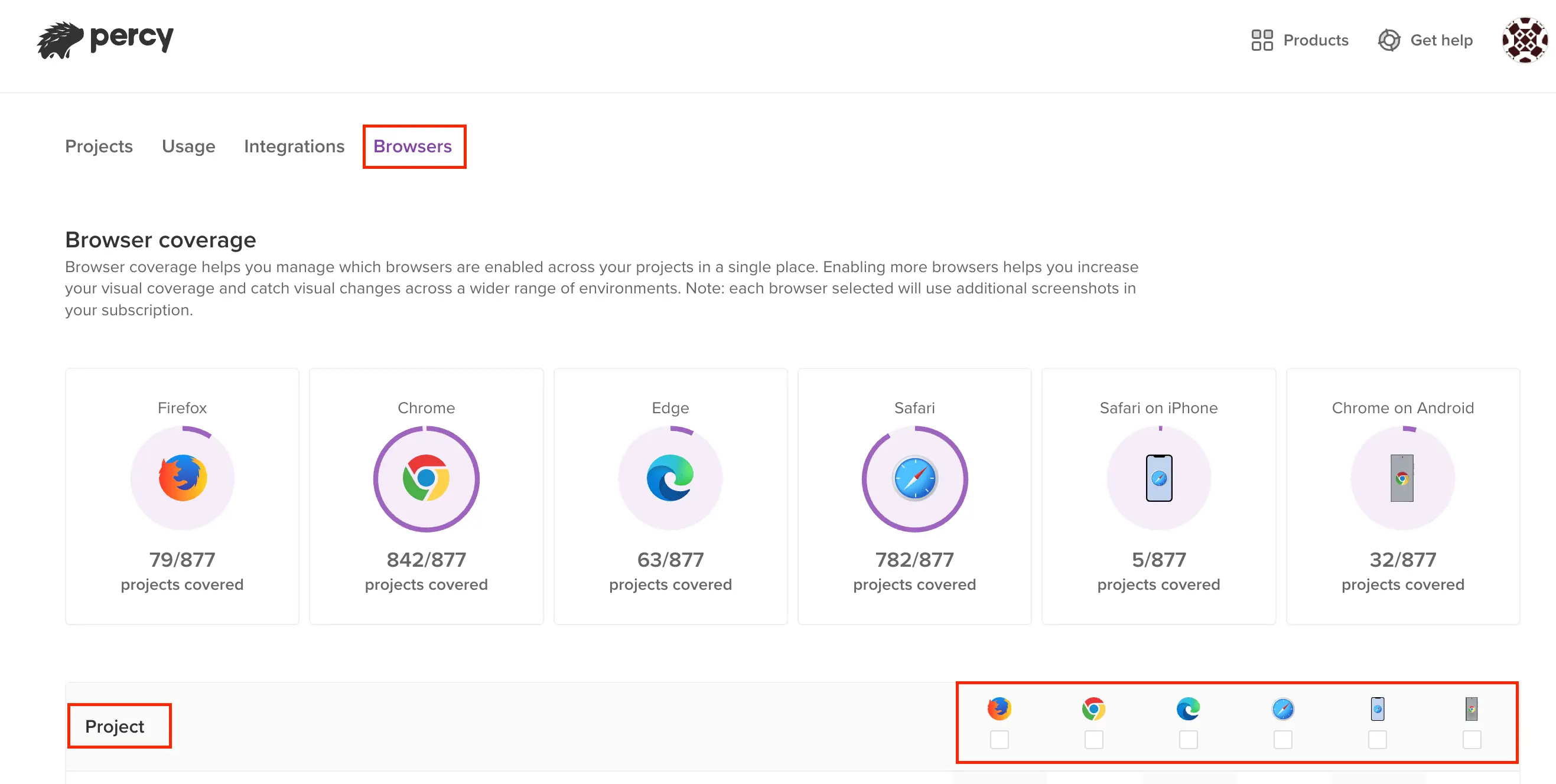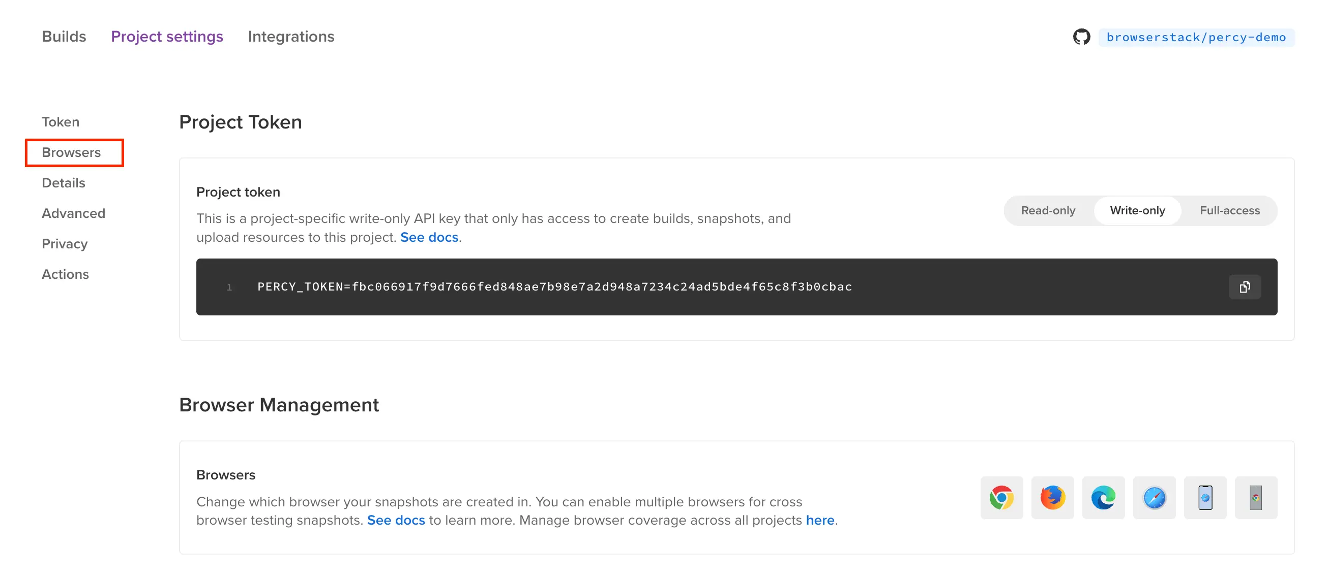 You can handle the browser’s management at the project level for all the individual builds, by selecting the browsers tab at Percy project home page.