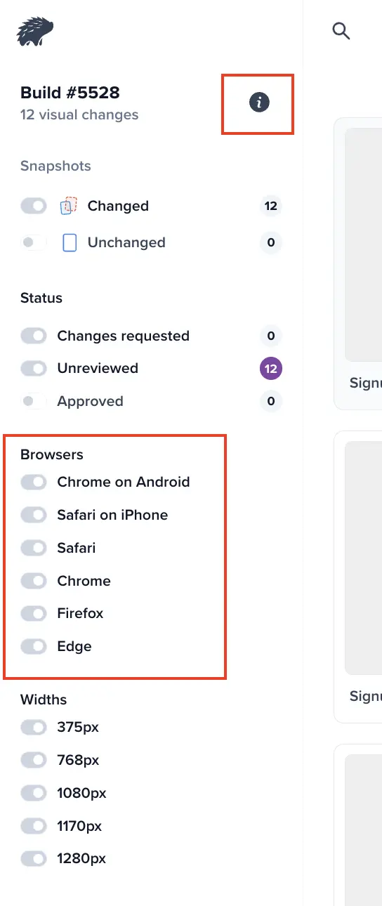 When cross-browser testing is enabled, each build will show separate screenshots for each browser, highlighting the visual diffs specific to each. The number of diffs for each browser will appear over the browser icon on your build.
