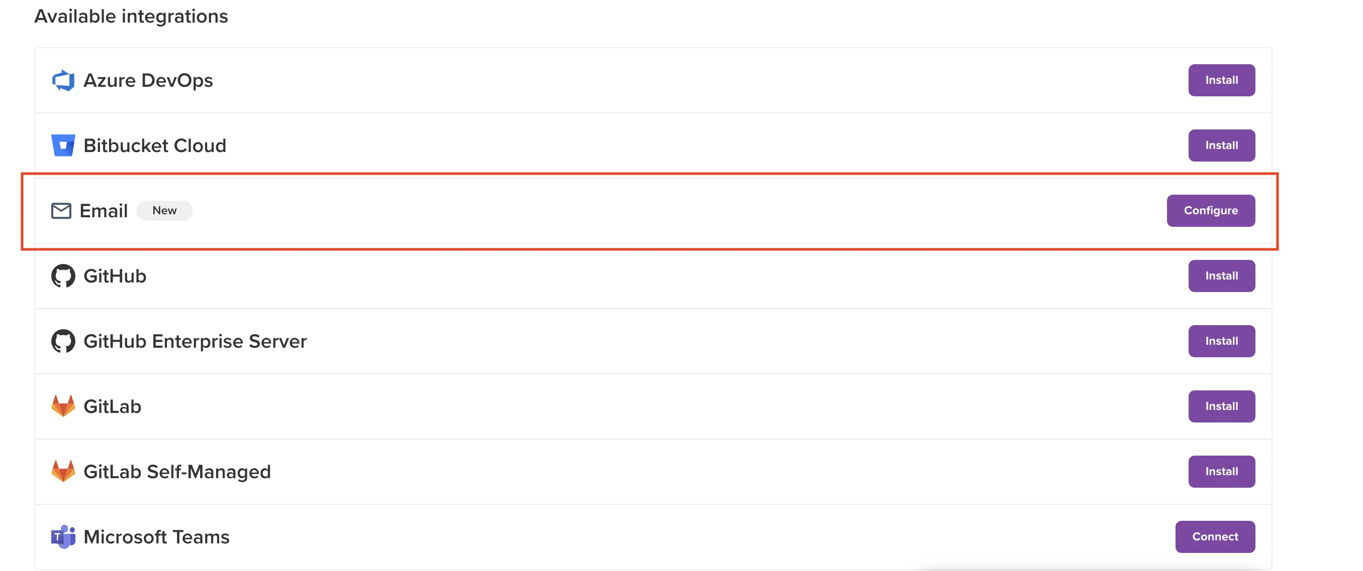 Navigate to the Integrations page and click Configure for Email to start setting up your first email notification.