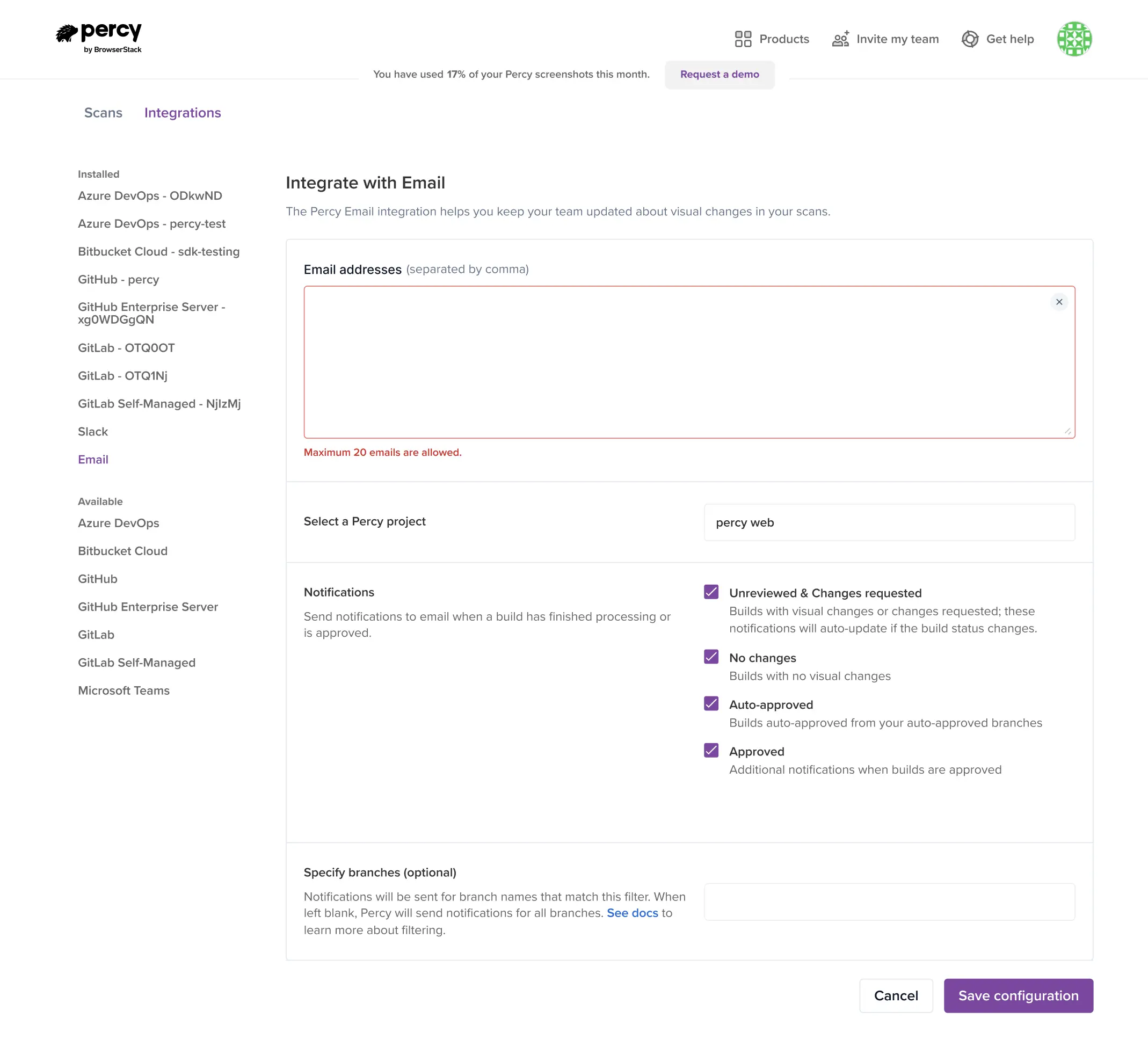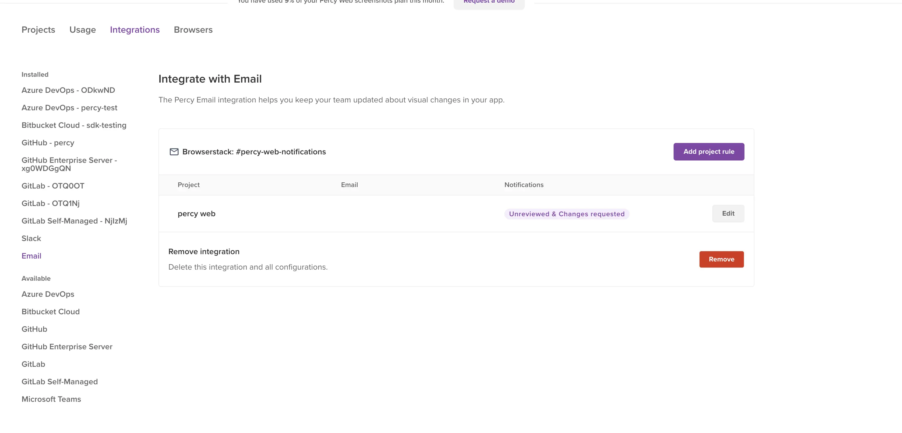 With this integration, you can configure unlimited email addresses and Percy projects. You can also specify what kinds of notifications you want to receive for each email address.