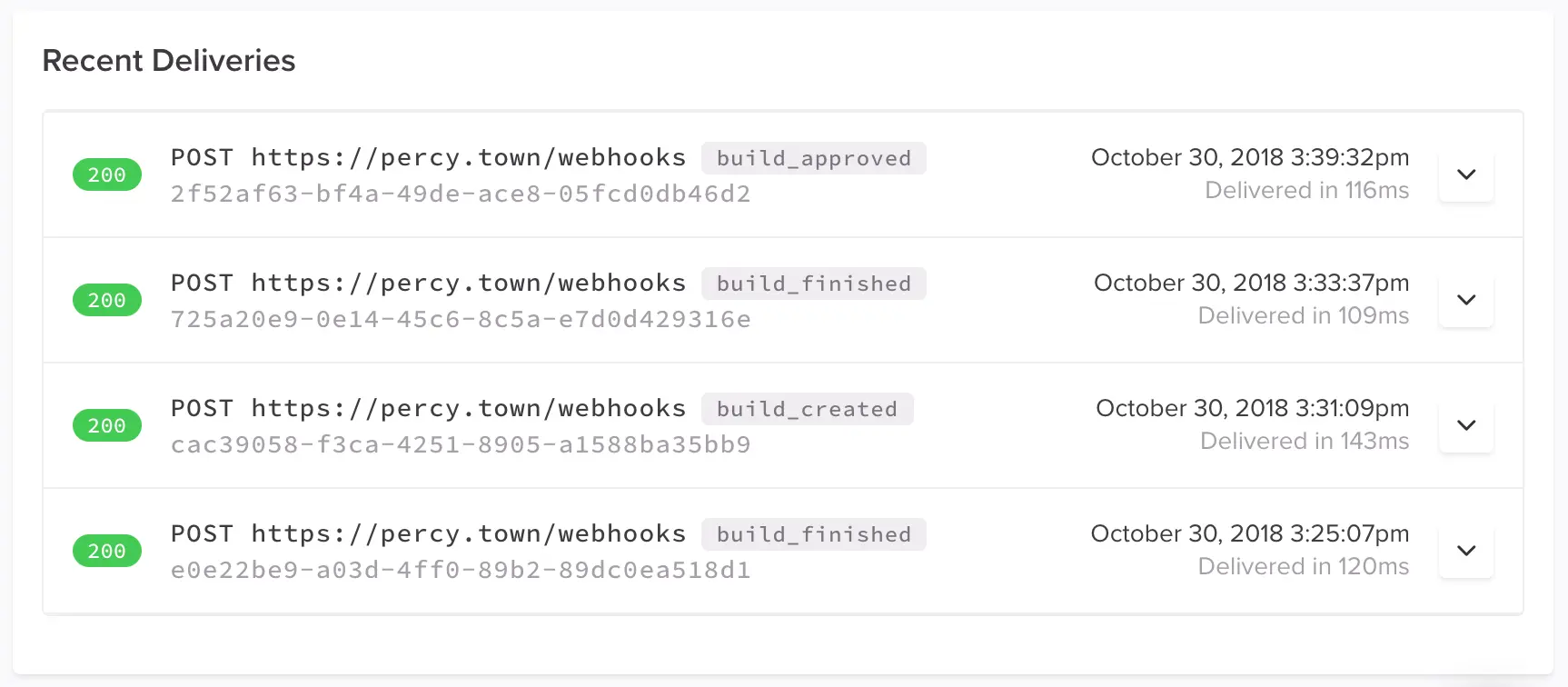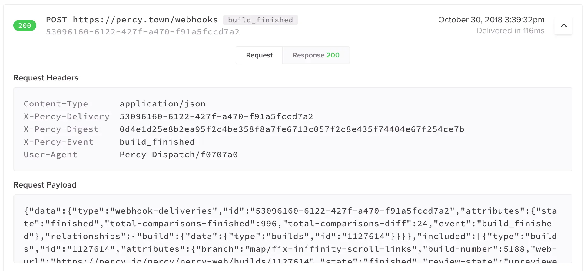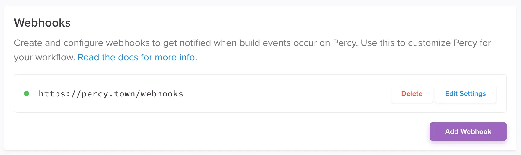 Get notified about your project’s activity on Percy with webhooks. Use webhooks to send Percy events and data to your servers to customize how Percy integrates with your workflow. If you’re curious what the webhooks send, these are examples of the various webhook payloads.