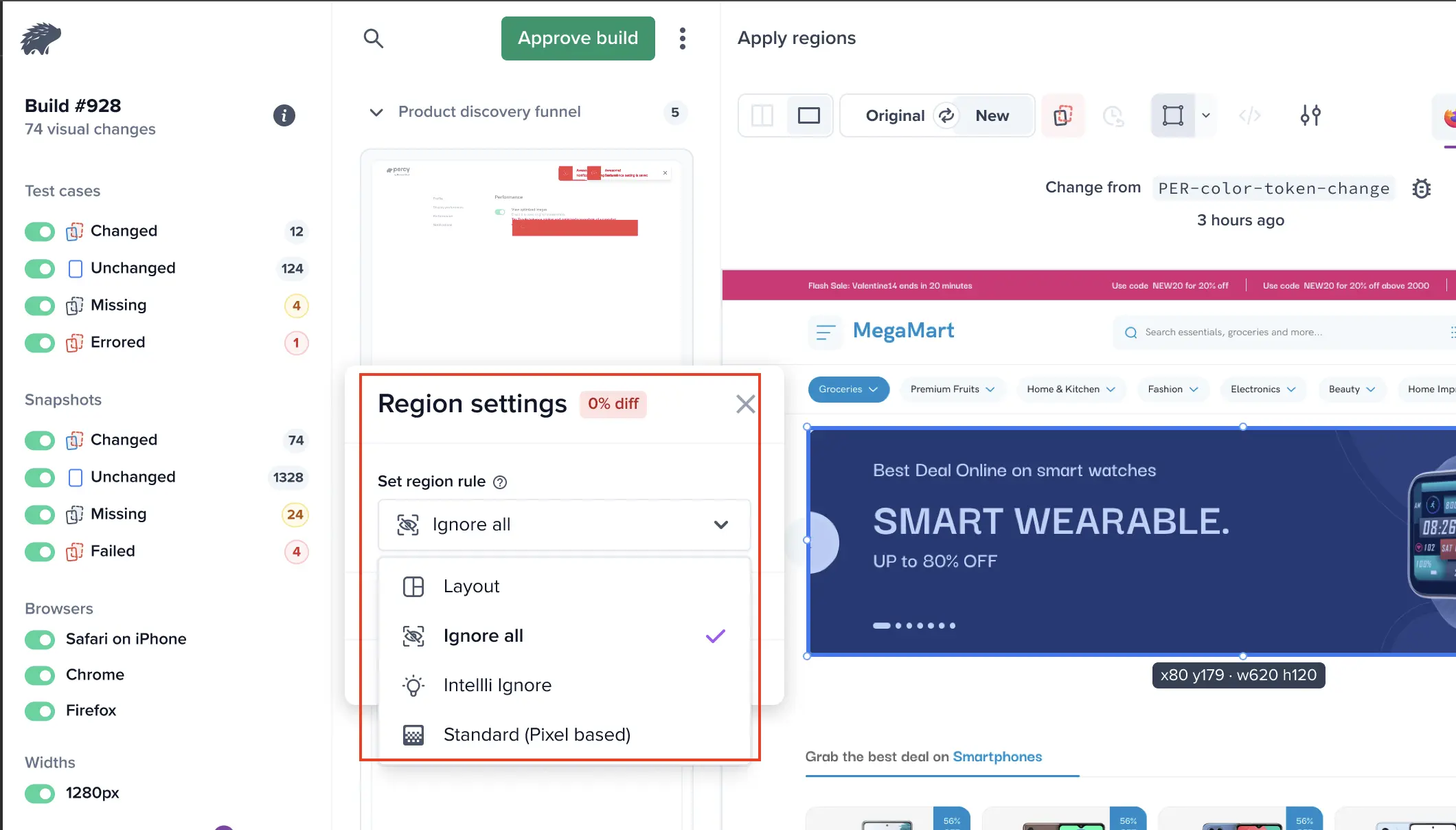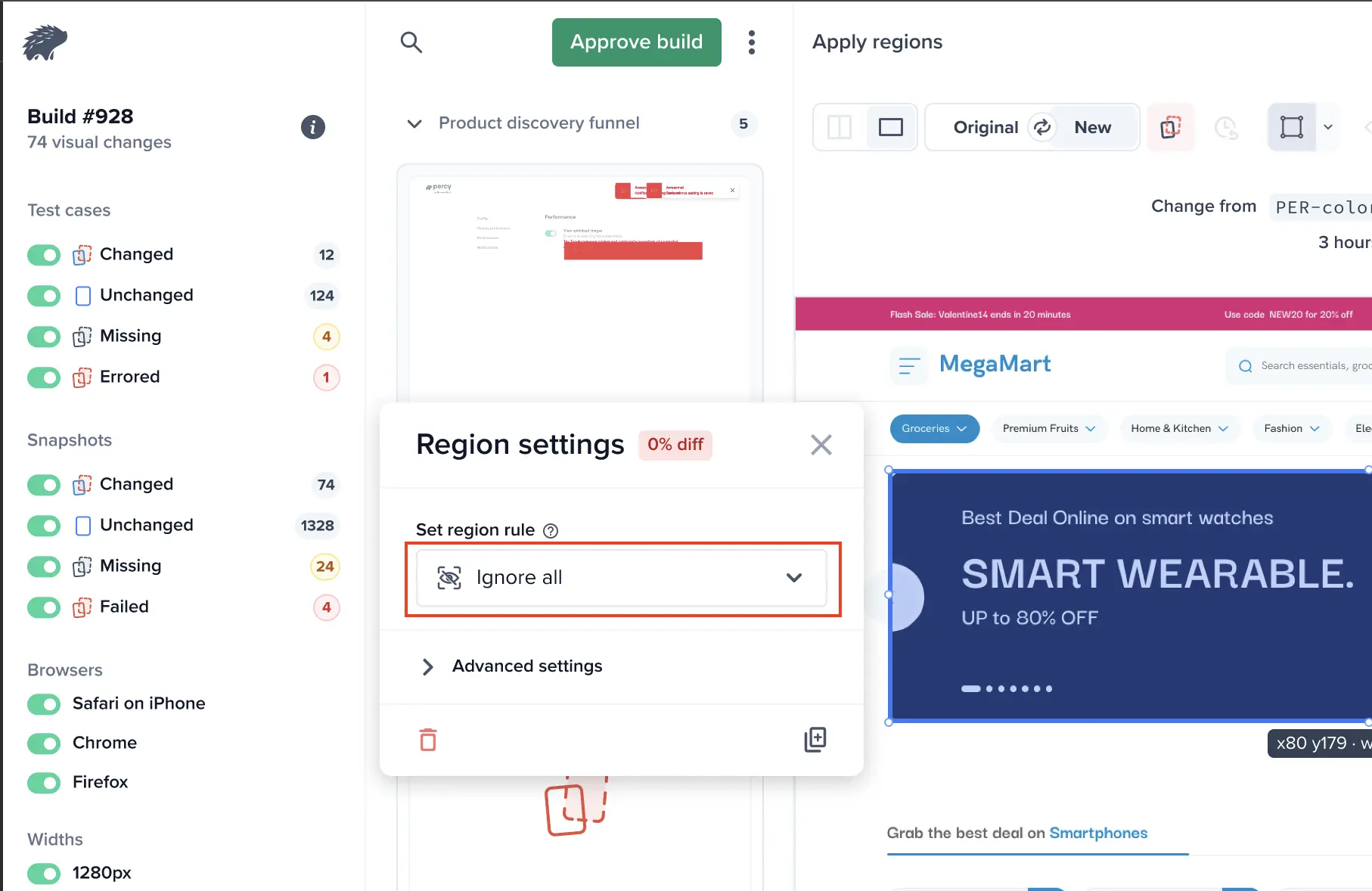 Select a build, open a snapshot, and click Apply Regions on the review screen of the Percy dashboard, you see two options: