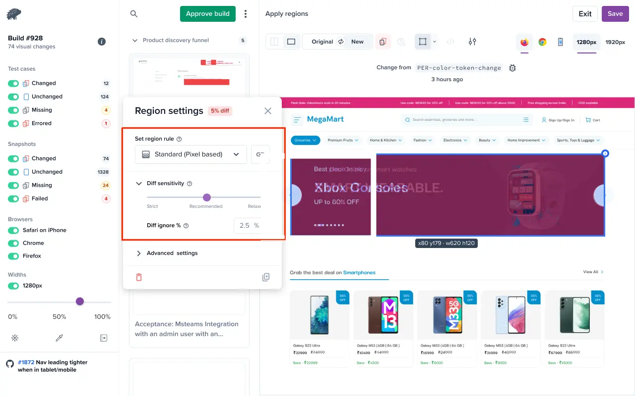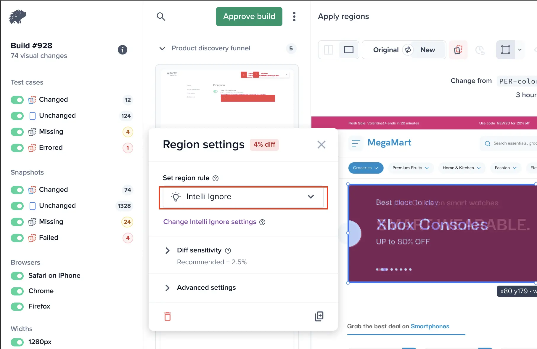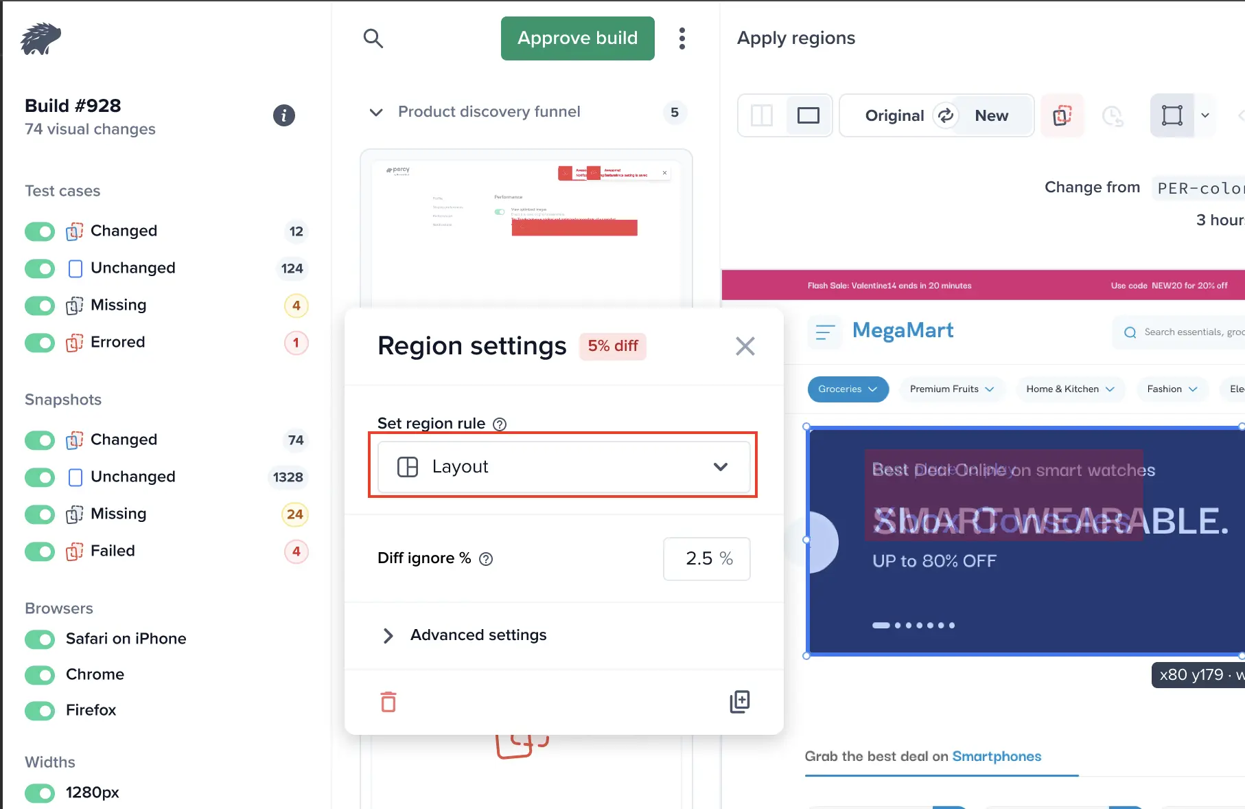 The Regions feature in Percy allows you to define specific areas of your UI for targeted visual testing. Regions can be drawn, selected, and configured directly within the Percy dashboard’s review screen. By default, regions are linked to DOM elements, but you can modify this configuration based on your testing needs.