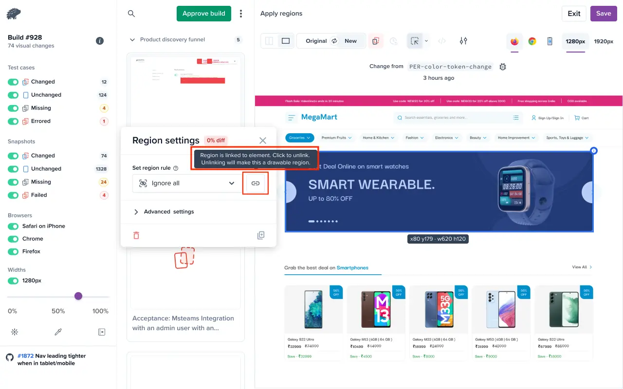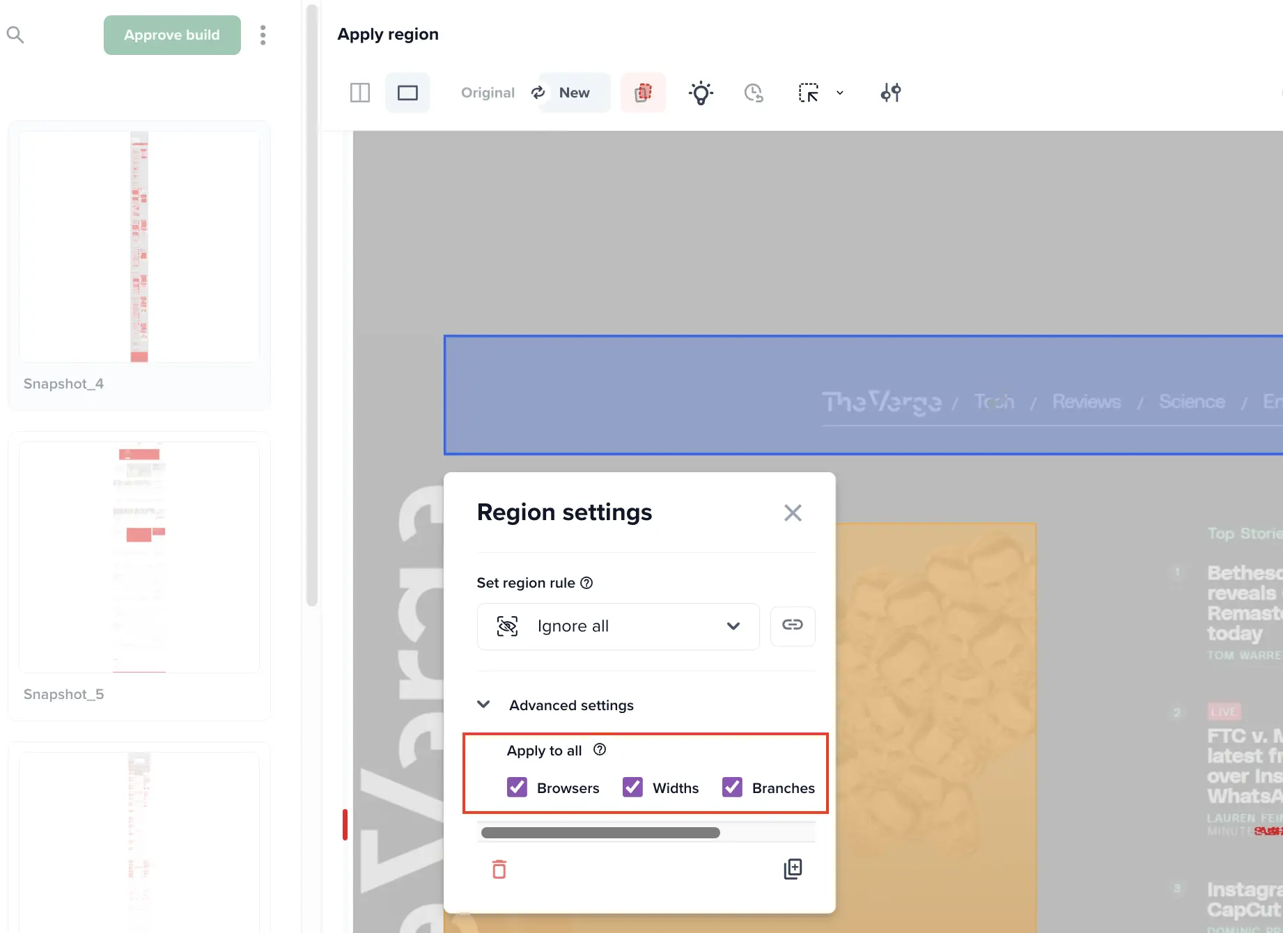 - Use Ignore Regions for elements with dynamic content, such as timestamps or user-generated text.