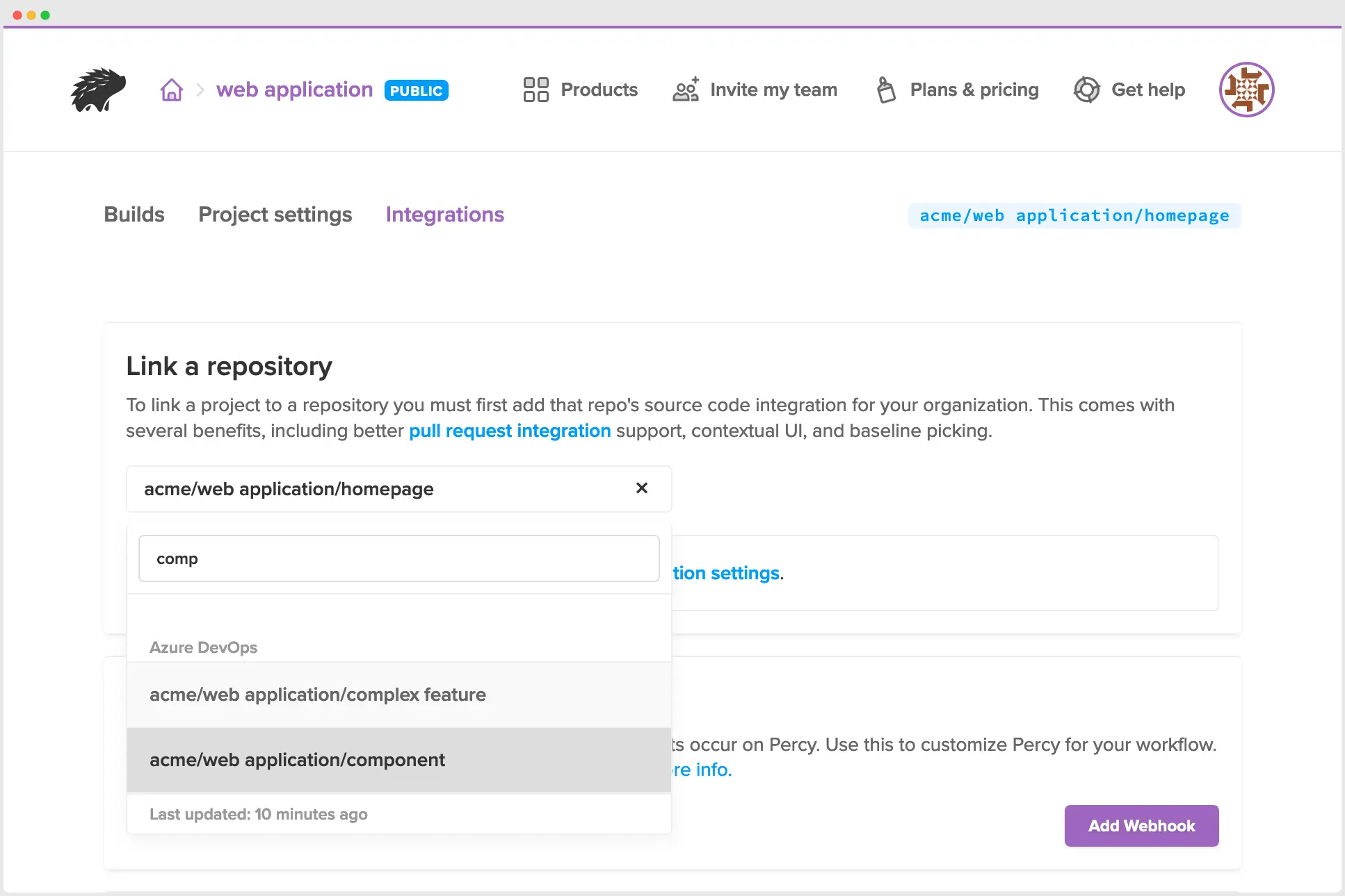 Once installed, the next step is to link a Percy project to an Azure DevOps repository.