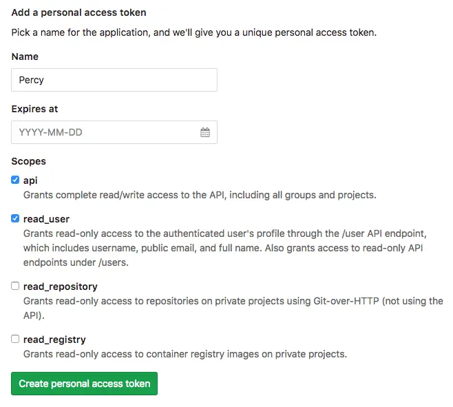 Once you have created a bot user and invited them to the GitLab project you intend to use with Percy, generate a personal access token with the following values: