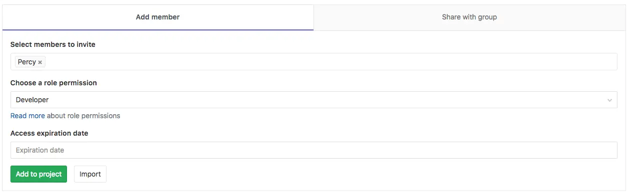 In GitLab, go to the project you want to integrate Percy with and grant your bot user “Developer” access to it.