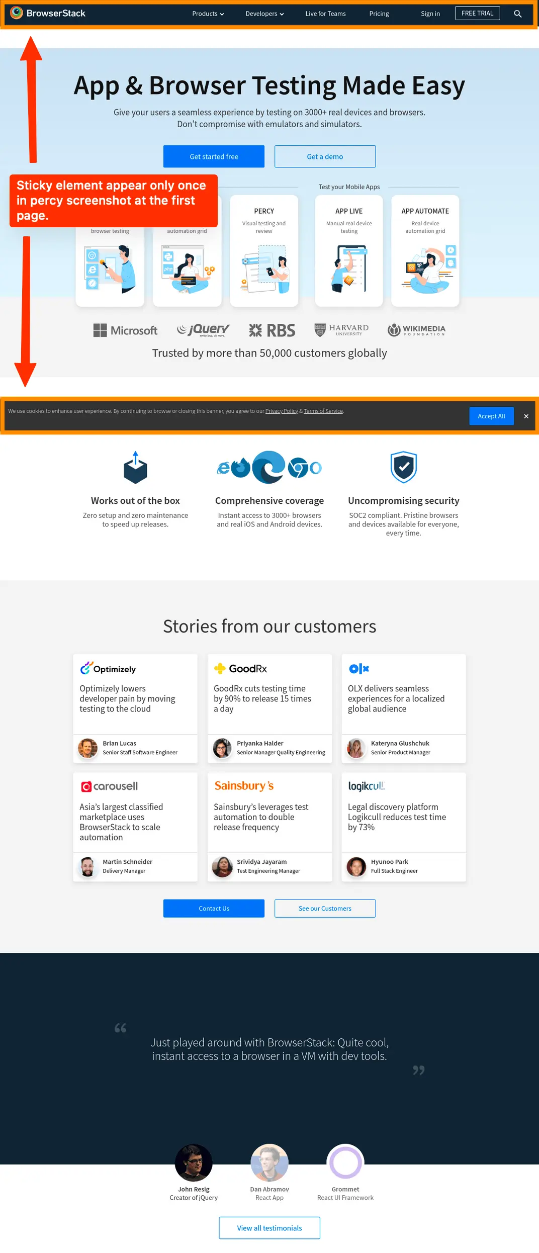 Percy captures full-page screenshots that reflect the webpage as it appears in the browser. In this state, fixed or static-positioned elements, such as sticky headers or footers, appear only once—typically at the top of the page—while the rest of the page remains free from these elements.