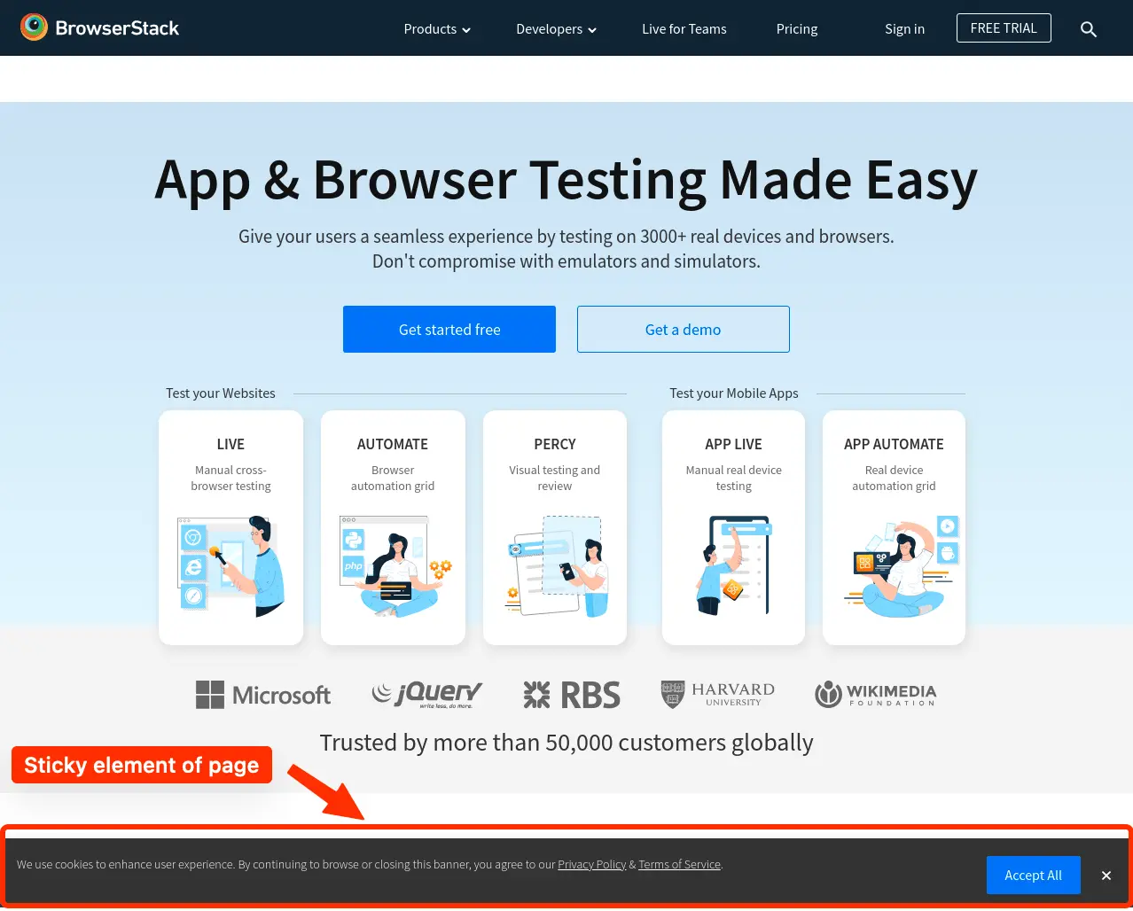 Another common scenario involves handling sticky elements like a cookie banner. On the website you are testing, you can choose to either accept or reject the cookie banner. In the following snippet, we are accepting the cookie: