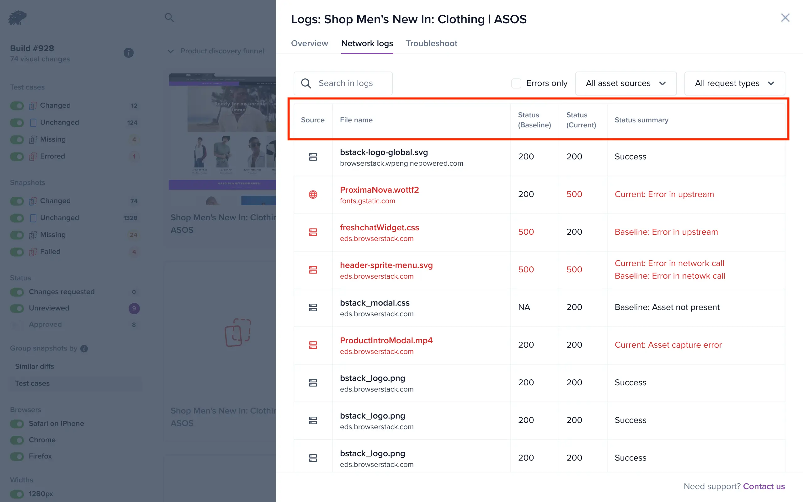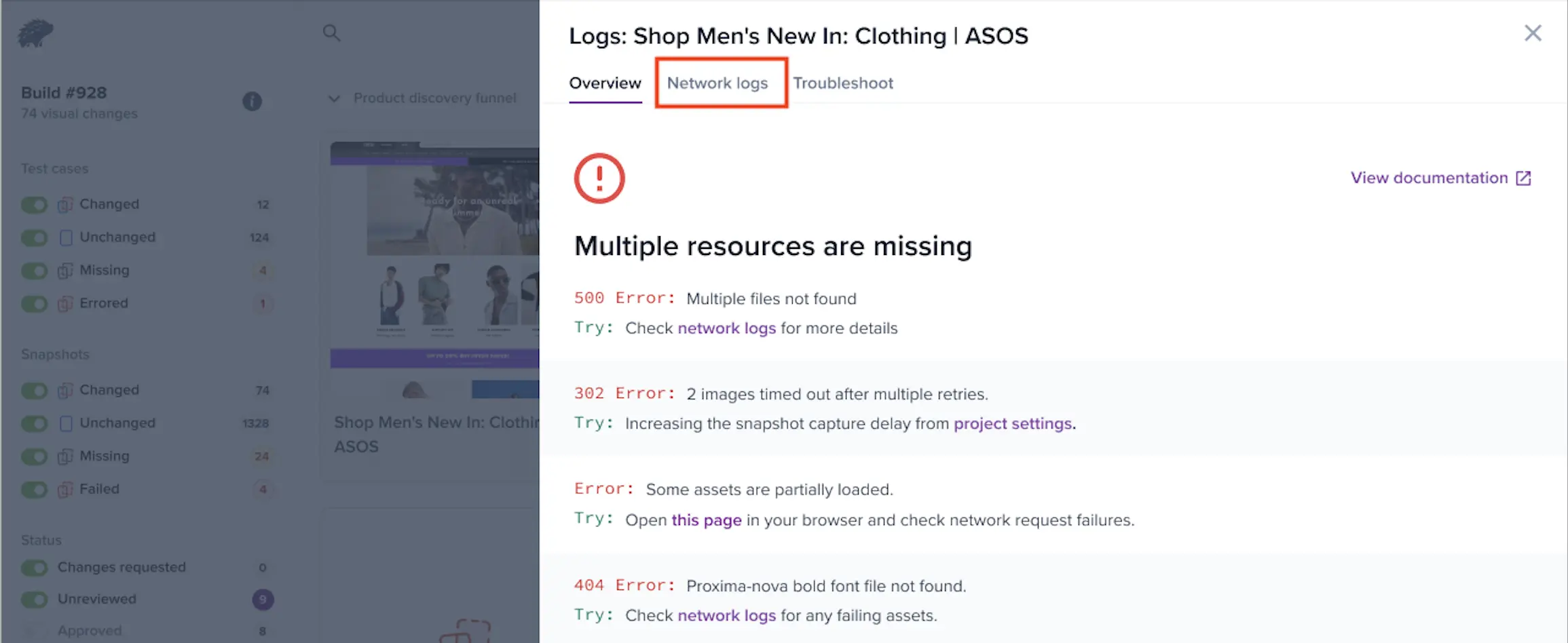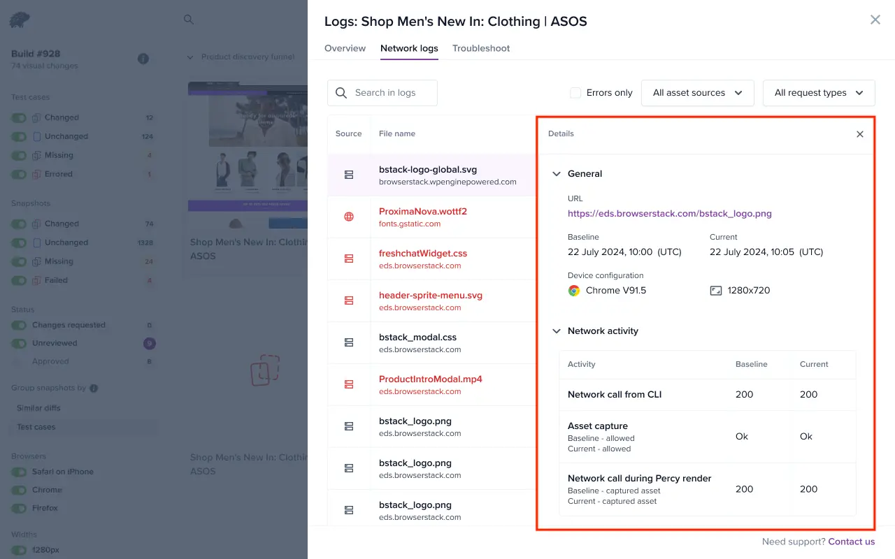 Percy’s Network logs feature gives you the ability to debug and identify where issues occurred during snapshot capturing. It provides detailed insights into network requests and their statuses, empowering you to diagnose problems effectively and take next steps in resolving any detected issues.