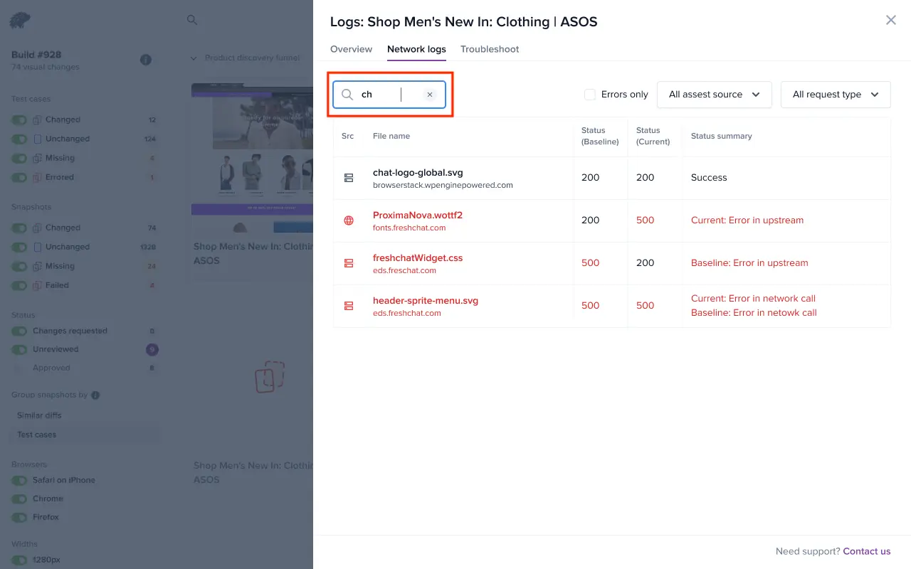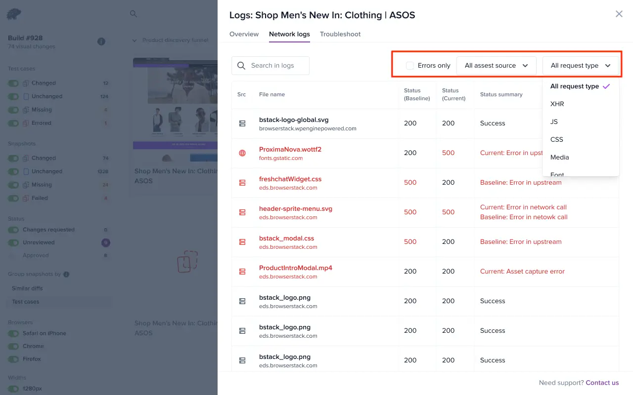 Filters: Apply filters to focus on specific network logs based on errors, asset source, and request type.