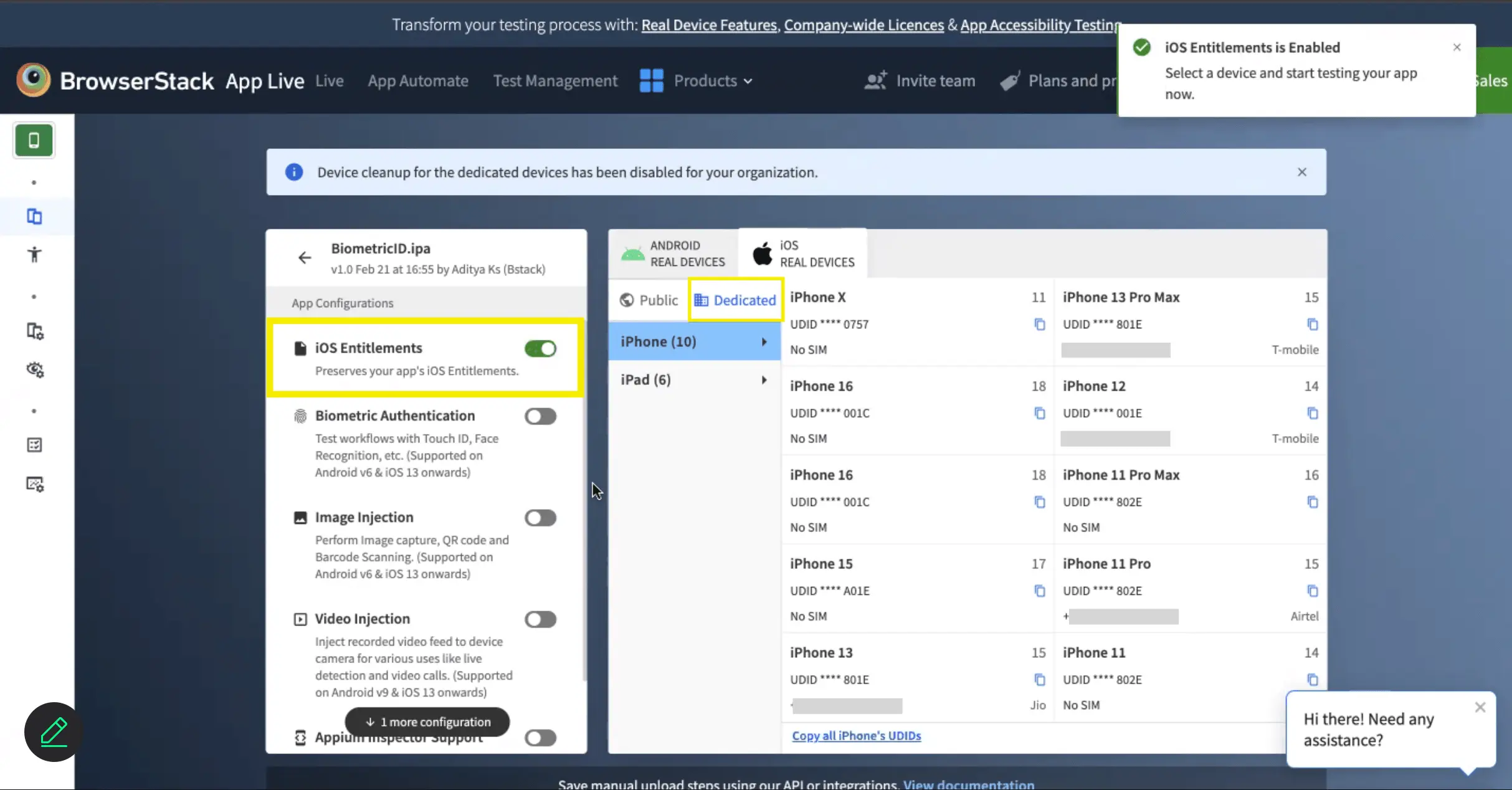 BrowserStack’s Private Devices ensures entitlements are preserved, enabling accurate and reliable testing for both developer-signed and enterprise-signed apps.