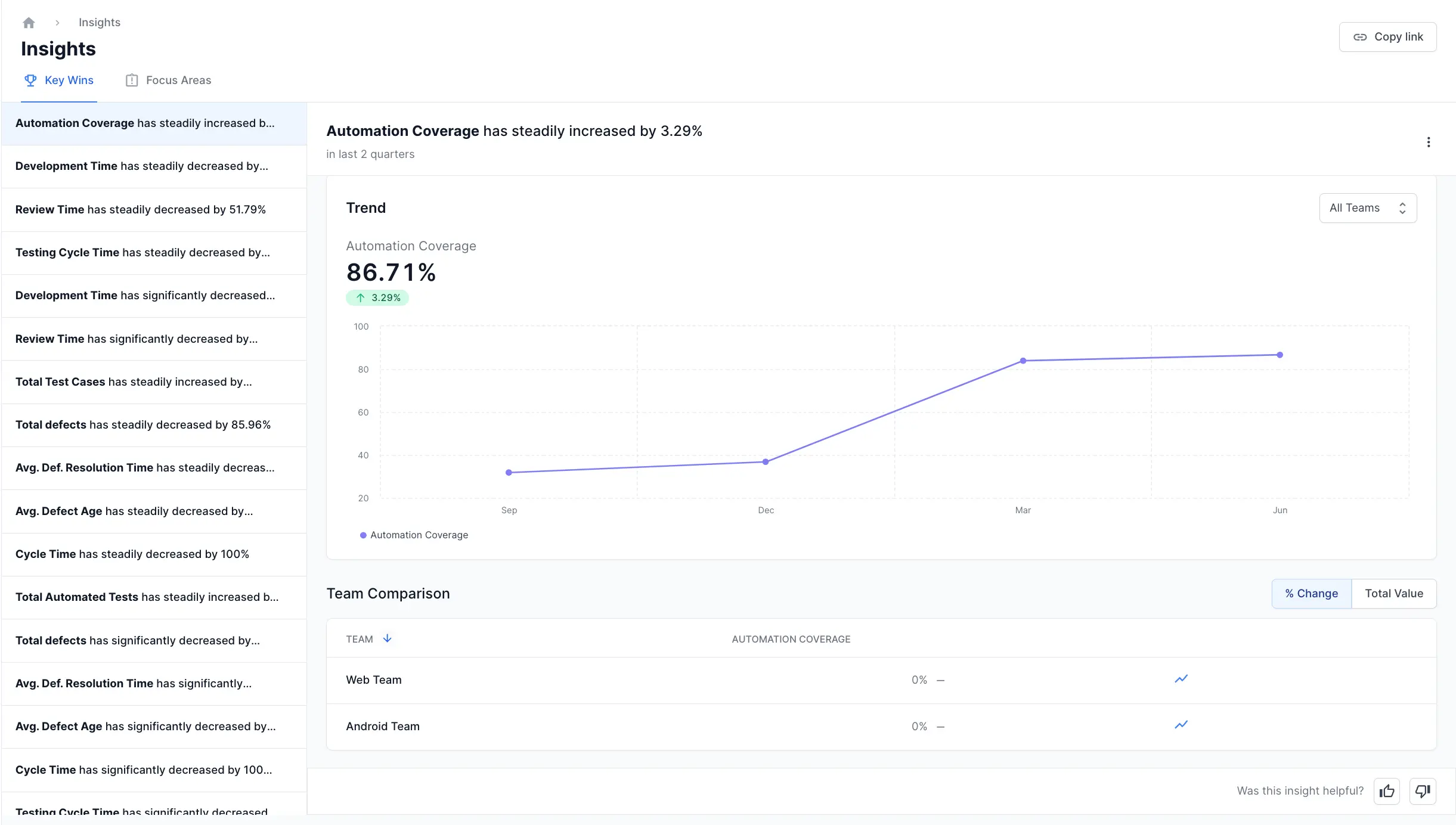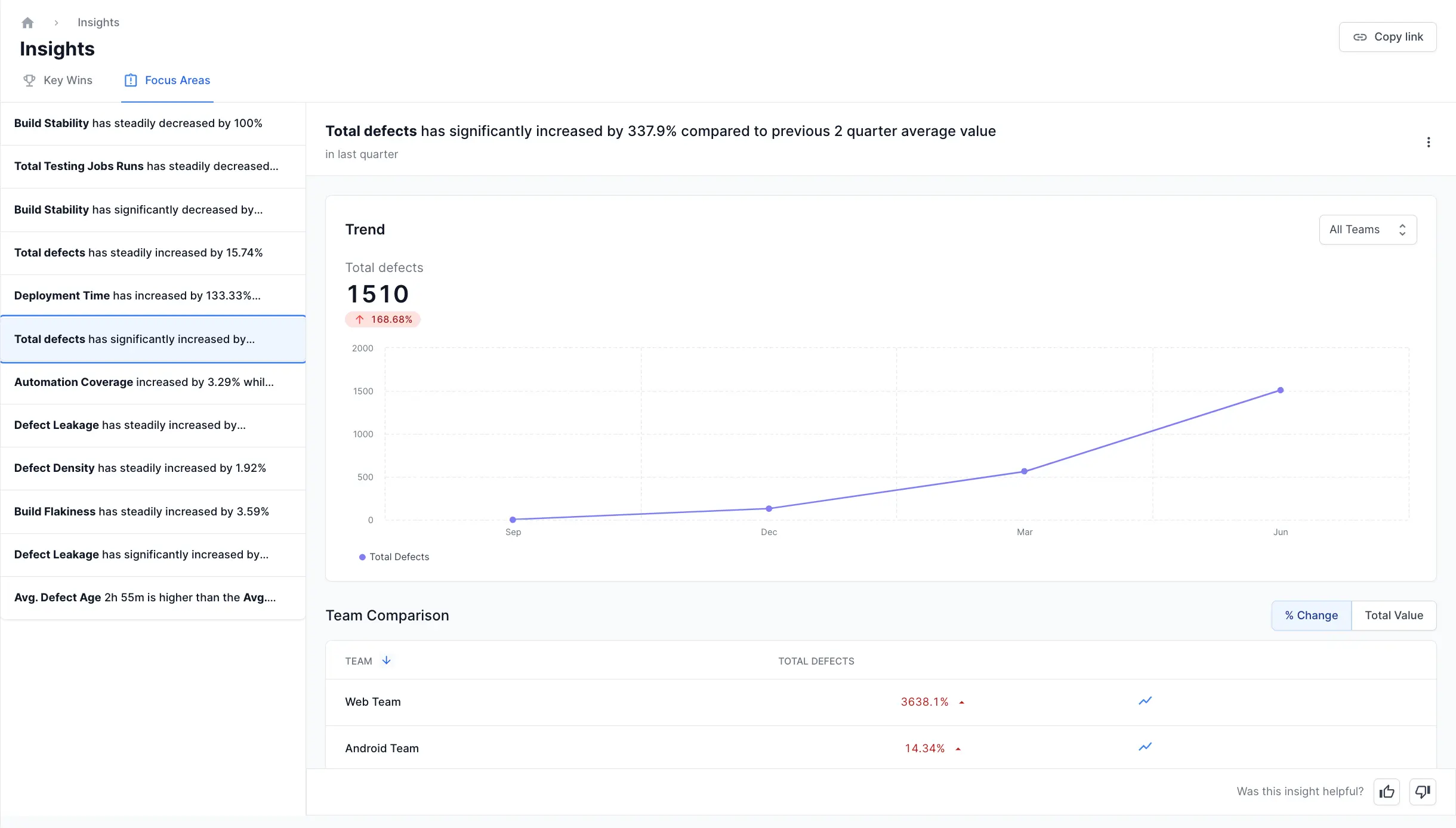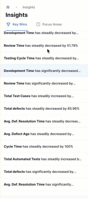 The Insights feature in Quality Dashboard provides a comprehensive view of your organization’s performance. It highlights Key Wins for positive trends and Focus Areas for metrics that need improvement. Each insight includes a summary of the trend, a visualization chart with team filters, team-wise comparisons, and detailed resolutions or impacts.