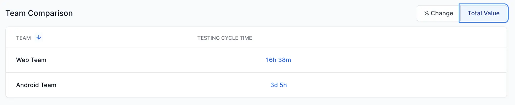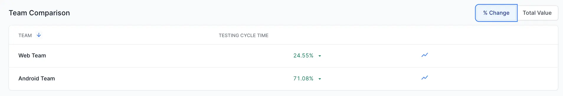 % Change: Shows percentage changes for the metric for each team. It highlights the increase or decrease in metrics.