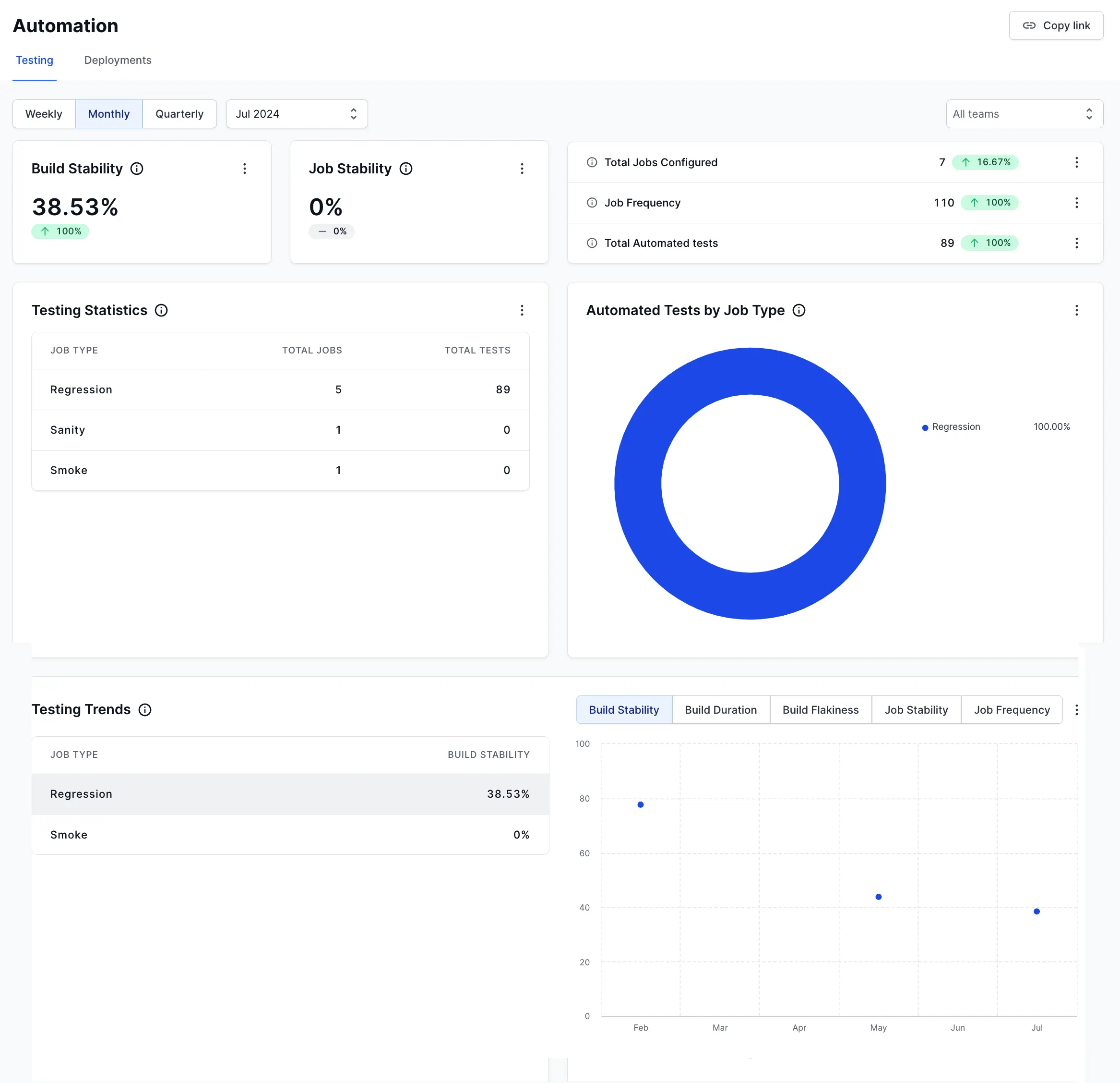 This dashboard gives you a clear view of your Cl automation. Key metrics include Build Stability (the percentage of passing tests) and Job Stability (the success rate of CI jobs). It helps you spot potential issues like flaky tests or long execution times. This provides insights to keep your automation running smoothly. Learn more about Automation Metrics here.